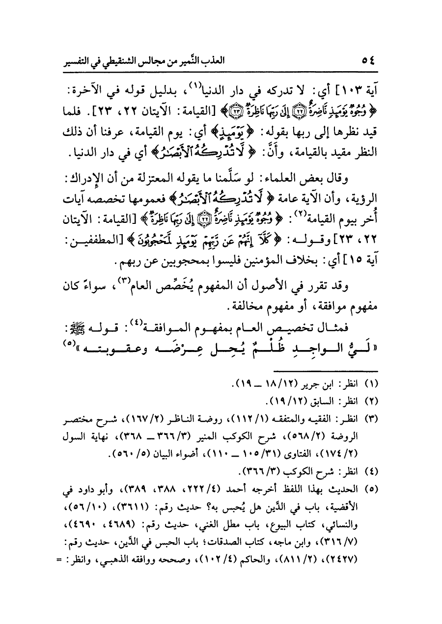 آية ١٠٣] أي: لَا تُدْرِكُهُ في دارِ الدنيا (¬١)، بدليلِ قولِه: في الآخرةِ: {وُجُوهٌ يَوْمَئِذٍ نَّاضِرَةٌ (٢٢) إِلَى رَبِّهَا نَاظِرَةٌ (٢٣)} [القيامة: الآيتان ٢٢، ٢٣]. فلما قَيَّدَ نظرَها إلى رَبِّهَا بقولِه: {يَوْمَئِذٍ} أي: يومَ القيامةِ، عَرَفْنَا أن ذلك النظرَ مقيدٌ بالقيامةِ، وأَنَّ: {لَاّ تُدْرِكُهُ الأَبْصَارُ} أي: في دارِ الدنيا.