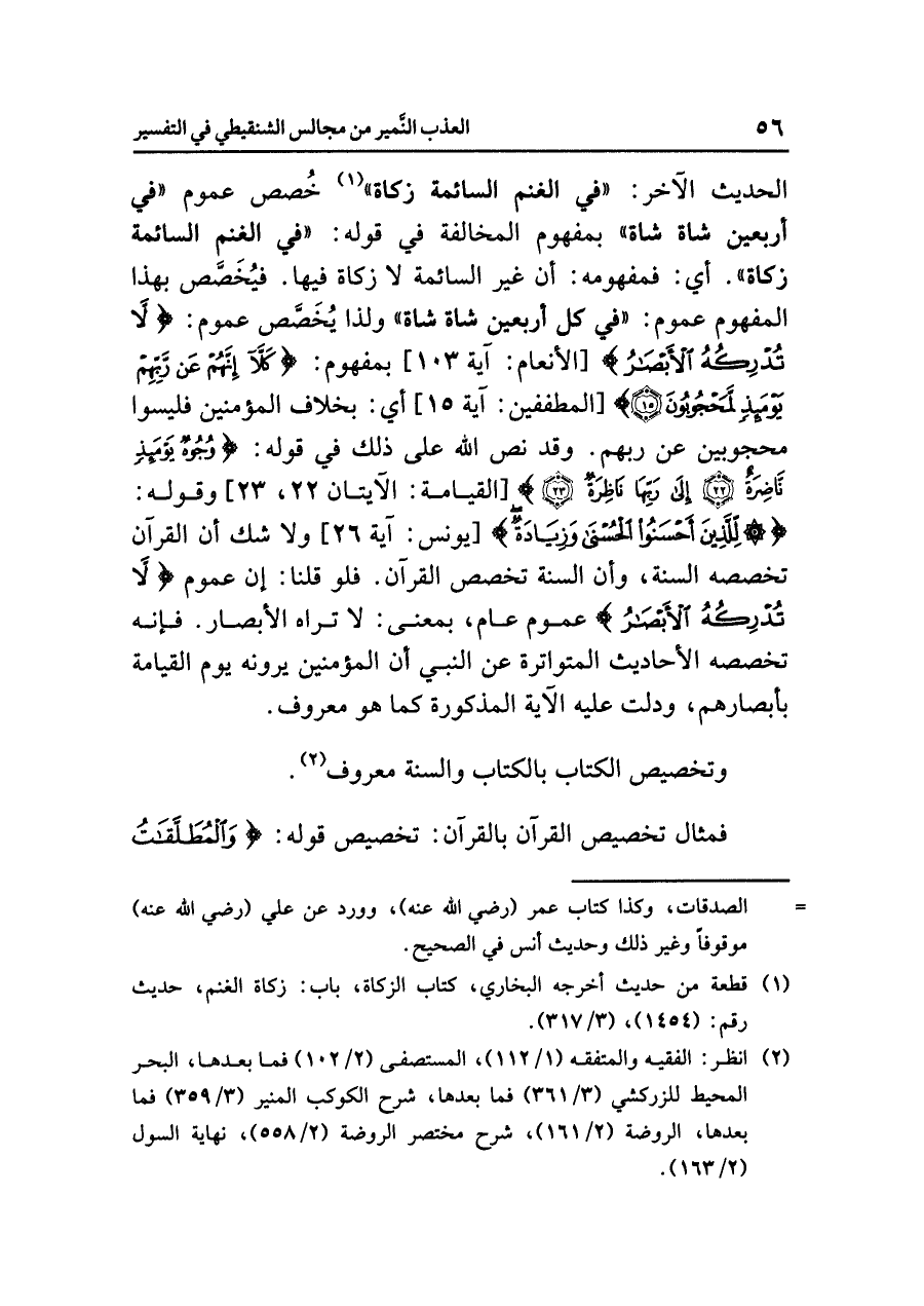 الحديثِ الآخَرِ: «فِي الْغَنَمِ السَّائِمَةِ زَكَاةٌ» (¬١) خُصِّصَ عمومُ: «فِي أَرْبَعِينَ شَاةً شَاةٌ» بمفهومِ المخالفةِ في قولِه: «فِي الْغَنَمِ السَّائِمَةِ زَكَاةٌ». أي: فمفهومُه: أن غيرَ السائمةِ لا زكاةَ فيها. فيُخَصَّصُ بهذا المفهومِ عمومُ: «فِي كُلِّ أَرْبَعِينَ شَاةً شَاةٌ» وَلِذَا يُخَصَّصُ عمومُ: {لَاّ تُدْرِكُهُ الأَبْصَارُ} [الأنعام: آية ١٠٣] بمفهومِ: {كَلَاّ إِنَّهُمْ عَن رَّبِّهِمْ يَوْمَئِذٍ لَّمَحْجُوبُونَ (١٥)} [المطففين: آية ١٥] أي: بخلافِ المؤمنين فليسوا مَحْجُوبِينَ عَنْ رَبِّهِمْ. وقد نَصَّ اللَّهُ على ذلك في قولِه: {وُجُوهٌ يَوْمَئِذٍ نَّاضِرَةٌ (٢٢) إِلَى رَبِّهَا نَاظِرَةٌ (٢٣)} [القيامة: الآيتان ٢٢، ٢٣] وقولُه: {لِّلَّذِينَ أَحْسَنُوا الْحُسْنَى وَزِيَادَةٌ} [يونس: آية ٢٦] ولَا شَكَّ أن القرآنَ تُخَصِّصُهُ السُّنَّةُ، وأن السُّنَّةَ تخصصُ القرآنَ. فلو قُلْنَا: إن عمومَ: {لَاّ تُدْرِكُهُ الأَبْصَارُ} عمومٌ عَامٌّ، بمعنَى: لا تَرَاهُ الأبصارُ. فإنه تُخَصِّصُهُ الأحاديثُ المتواترةُ عن النبيِّ أن المؤمنين يَرَوْنَهُ يومَ القيامةِ بأبصارِهم، وَدَلَّتْ عليه الآيةُ المذكورةُ كما هو مَعْرُوفٌ.