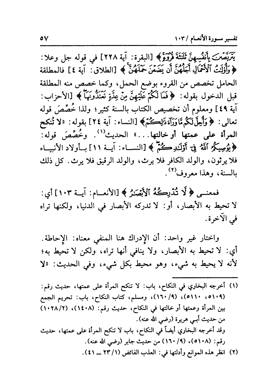 يَتَرَبَّصْنَ بِأَنفُسِهِنَّ ثَلَاثَةَ قُرُوَءٍ} [البقرة: آية ٢٢٨]، في قولِه جل وعلا: {وَأُوْلَاتُ الْأَحْمَالِ أَجَلُهُنَّ أَنْ يَضَعْنَ حَمْلَهُنَّ} [الطلاق: آية ٤]، فالمطلقةُ الحاملُ تُخَصَّصُ من القروءِ بوضعِ الحملِ، وكما خَصَّصَ منه المطلقةَ قبل الدخولِ بقولِه: {فَمَا لَكُمْ عَلَيْهِنَّ مِنْ عِدَّةٍ تَعْتَدُّونَهَا} [الأحزاب: آية ٤٩] ومعلومٌ أَنَّ تخصيصَ الكتابِ بالسنةِ كثيرةٌ؛ وَلِذَا خُصِّصَ قولُه تعالى: {وَأُحِلَّ لَكُم مَّا وَرَاءَ ذَلِكُمْ} [النساء: آية ٢٤] بقولِه: «لَا تُنْكَحُ الْمَرْأَةُ عَلَى عَمَّتِهَا أَوْ خَالَتِهَا ... » الحديثَ (¬١). وخُصِّصَ قولُه: {يُوصِيكُمُ اللَّهُ فِي أَوْلَادِكُمْ} [النساء: آية ١١] بأولادِ الأنبياءِ فلَا يَرِثُونَ، والولدِ الكافرِ فَلَا يَرِثُ، والولدِ الرقيقِ فلَا يَرِثُ. كُلُّ ذلك بالسُّنَّةِ، وهذا معروفٌ (¬٢).