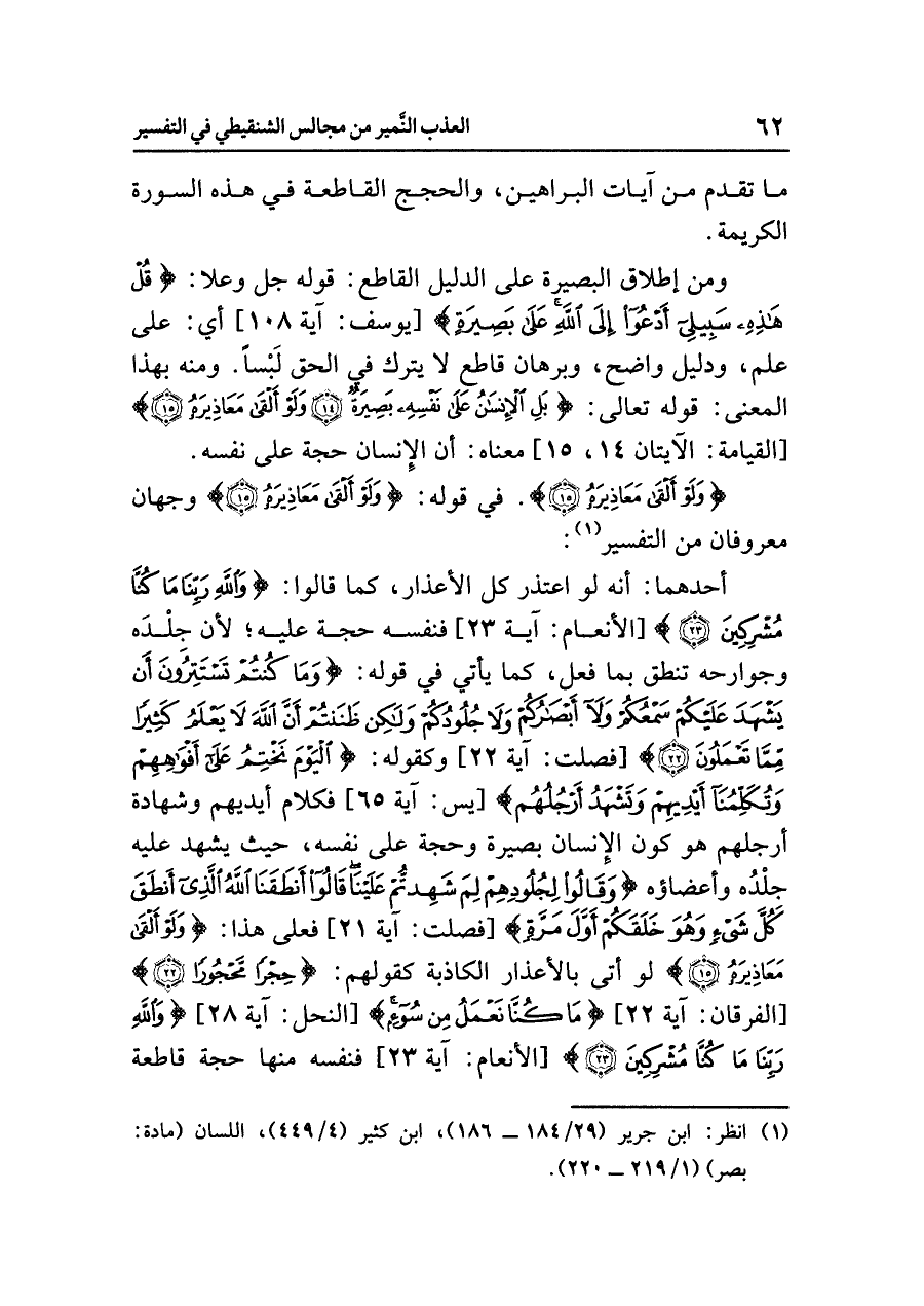 ومن إطلاقِ البصيرةِ على الدليلِ القاطعِ: قولُه جل وعلا: {قُلْ هَذِهِ سَبِيلِي أَدْعُو إِلَى اللَّهِ عَلَى بَصِيرَةٍ} [يوسف: آية ١٠٨]، أي: على عِلْمٍ ودليلٍ واضحٍ وبرهانٍ قاطعٍ لَا يَتْرُكُ فِي الحقِّ لَبْسًا. ومنه بهذا المعنَى: قولُه تعالى: {بَلِ الإِنْسَانُ عَلَى نَفْسِهِ بَصِيرَةٌ (١٤) وَلَوْ أَلْقَى مَعَاذِيرَهُ (١٥)} [القيامة: الآيتان ١٤، ١٥] معناه: أن الإنسانَ حجةٌ على نفسِه. {وَلَوْ أَلْقَى مَعَاذِيرَهُ (١٥)} قولُه: {وَلَوْ أَلْقَى مَعَاذِيرَهُ (١٥)} وجهانِ معروفانِ من التفسيرِ (¬١):