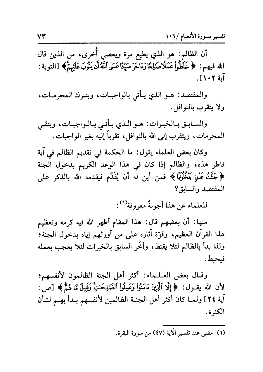 وقال بعضُ العلماءِ: أكثرُ أهلِ الجنةِ الظالمونَ لأَنْفُسِهِمْ؛ لأَنَّ اللَّهَ يقولُ: {إِلَاّ الَّذِينَ آمَنُوا وَعَمِلُوا الصَّالِحَاتِ وَقَلِيلٌ مَّا هُمْ} [ص: آية ٢٤] وَلَمَّا كان أكثرُ أهلِ الجنةِ الظالمين لأنفسهم بدأَ بهم لشأنِ الكثرةِ.