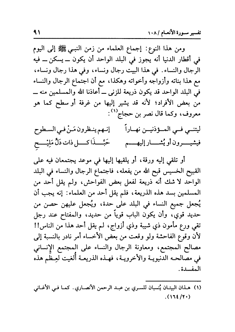 ومن هذا النوعِ: إجماعُ العلماءِ من زمنِ النبيِّ - صلى الله عليه وسلم - إلى اليومِ في أقطارِ الدنيا أنه يجوزُ في البلدِ الواحدِ أن يكونَ - يَسْكُنُ - فيه الرجالُ والنساءُ. في هذا البيتِ رجالٌ ونساء، وفي هذا رجالٌ ونساءٌ، مع هذا بناتُه وأزواجُه وأخواتُه وهكذا، مع أن اجتماعَ الرجالِ والنساءِ في البلدِ الواحدِ قد يكونُ ذريعةً للزنى - أَعَاذَنَا اللَّهُ والمسلمين منه - من بعضِ الأفرادِ؛ لأنه قد يشيرُ إليها من غرفةٍ أو سَطْحٍ كما هو معروفٌ، وكما قال نَصْرُ بْنُ حَجَّاجٍ (¬١):