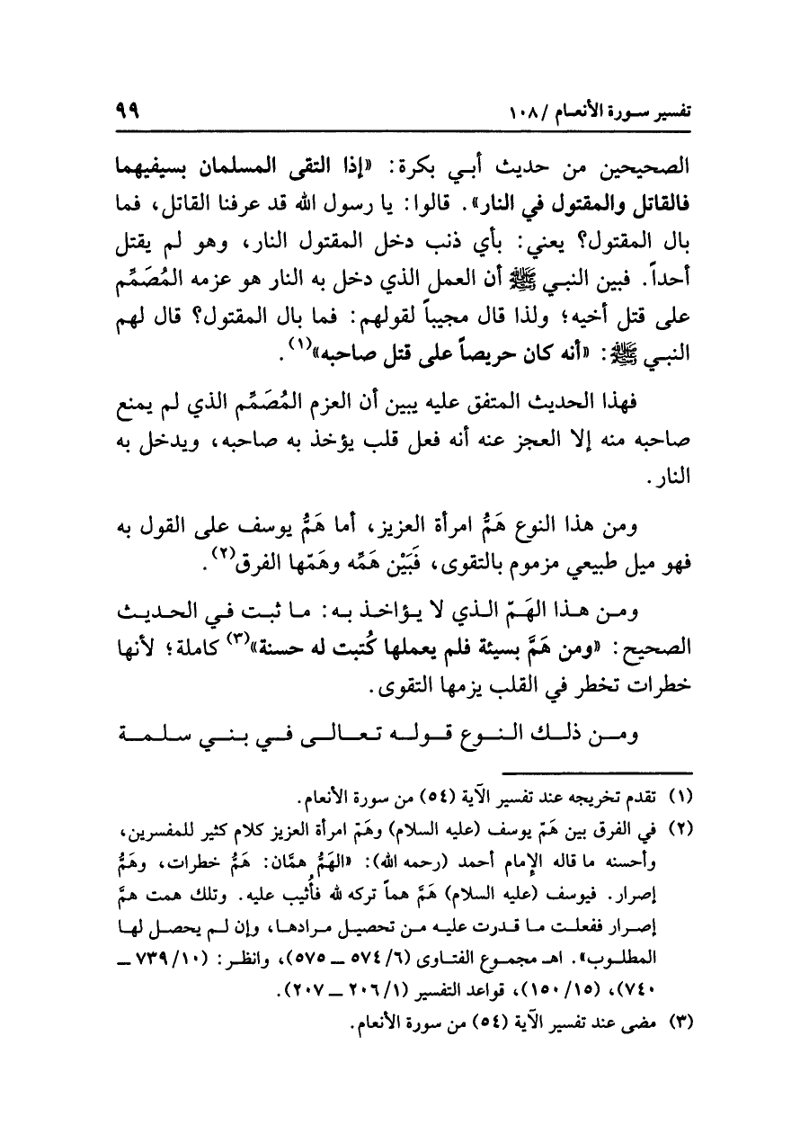 (¬٢) في الفرق بين هَمّ يوسف (عليه السلام) وهَمّ امرأة العزيز كلام كثير للمفسرين، وأحسنه ما قاله الإمام أحمد (رحمه الله): «الهمُّ هَمَّان: همُّ خطرات، وهمُّ إصرار. فيوسف (عليه السلام) هَمّ همًّا تركه لله فأثيب عليه. وتلك همت همَّ إصرار ففعلت ما قدرت عليه من تحصيل مرادها، وإن لم يحصل لها المطلوب» ا. هـ مجموع الفتاوى (٦/ ٥٧٤ - ٥٧٥)، وانظر: (١٠/ ٧٣٩ - ٧٤٠)، (١٥/ ١٥٠)، قواعد التفسير (١/ ٢٠٦ - ٢٠٧).