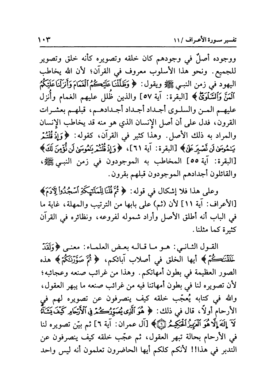 ووجوده أصلٌ في وجوده كان خلقه وتصويره كأنه خلق وتصوير للجميع. ونحو هذا الأسلوب معروف في القرآن؛ لأن الله يخاطب اليهود في زمن النبي صلى الله عليه وسلم ويقول: {وَظَلَّلْنَا عَلَيْكُمُ الْغَمَامَ وَأَنزَلْنَا عَلَيْكُمُ الْمَنَّ وَالسَّلْوَى} [البقرة: آية ٥٧] والذين ظُلل عليهم الغمام وأُنزل عليهم المن والسلوى أجداد أجداد أجدادهم، قبلهم بعشرات القرون، فَدَلَّ على أن أصْلَ الإنسان الذي هو منه قَدْ يُخَاطَب الإنسان والمراد به ذلك الأصل، وهذا كثير في القرآن، كقوله: {وَإِذْ قُلْتُمْ يَا مُوسَى لَن نَّصْبِرَ عَلَىَ} [البقرة: آية ٦١] {وَإِذْ قُلْتُمْ يَا مُوسَى لَن نُّؤْمِنَ لَكَ} [البقرة: آية ٥٥] المخاطب به الموجودون في زمن النبي صلى الله عليه وسلم، والقائلون أجدادهم الموجودون قبلهم بقرون.