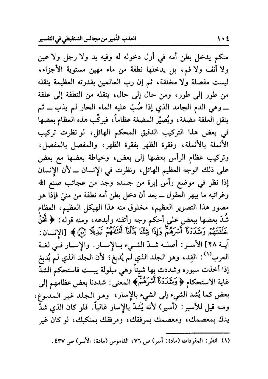 القِدّ، وهو الجلد الذي لم يُدبغ؛ لأن الجلد الذي لم يُدبغ إذا أخذت سيوره وشددت بها شيئاً وهي مبلولة يبست فاستحكم الشدّ غاية الاستحكام {وَشَدَدْنَا أَسْرَهُمْ} المعنى: شددنا بعض عظامهم إلى بعض كما يُشد الشيء إلى الشيء بالإسار، وهو الجلد غير المدبوغ، ومنه قيل للأسير: (أسير) لأنه يُشَدُّ بالإسار غالباً، فلو كان الذي شدّ يدك بمعصمك، ومعصمك بمرفقك، ومرفقك بمنكبك، لو كان غير