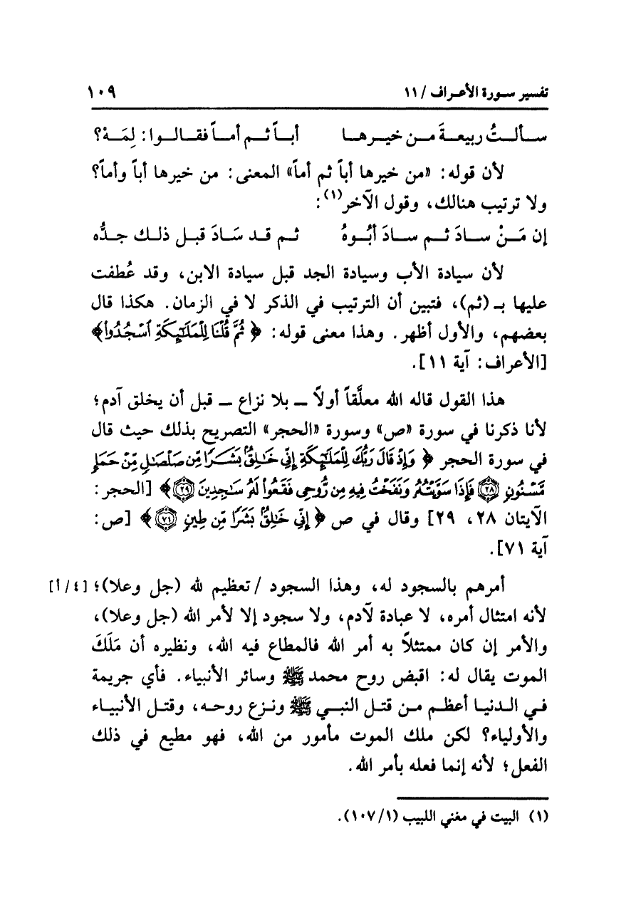 لأن سيادة الأب وسيادة الجد قبل سيادة الابن، وقد عُطفت عليها بـ (ثم)، فتبين أن الترتيب في الذكر لا في الزمان. هكذا قال بعضهم، والأول أظهر. وهذا معنى قوله: {ثُمَّ قُلْنَا لِلْمَلآئِكَةِ} [الأعراف: آية ١١].