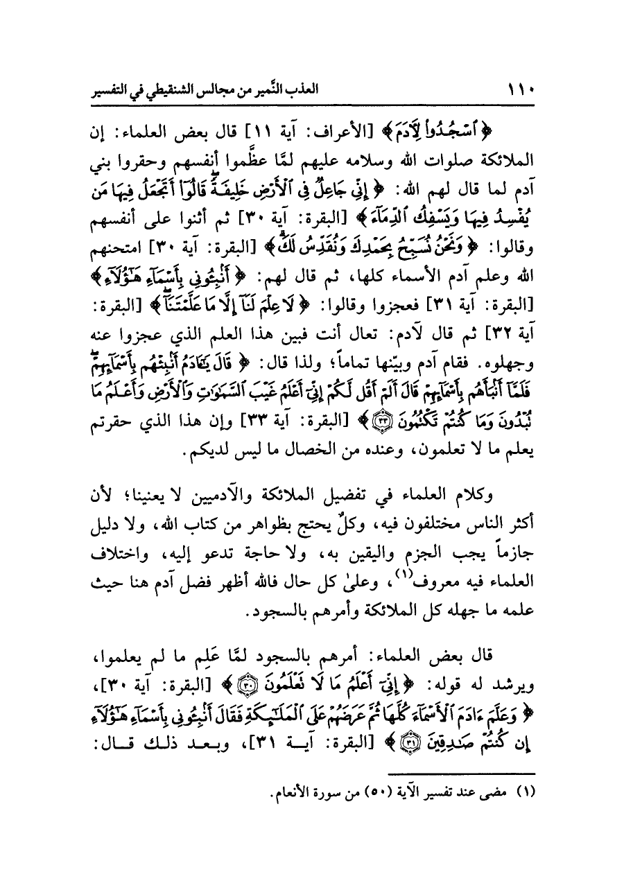 وكلام العلماء في تفضيل الملائكة والآدميين لا يعنينا؛ لأن أكثر الناس مختلفون فيه، وكلٌّ يَحْتَجُّ بِظَوَاهِر من كتاب الله، ولا دليل جازماً يجب الجزم واليقين به، ولا حاجة تدعو إليه، واختلاف العلماء فيه معروف (¬١)، وعلى كل حال فالله أظهر فضل آدم هنا حيث علمه ما جهله كل الملائكة وأمَرَهم بالسجود.