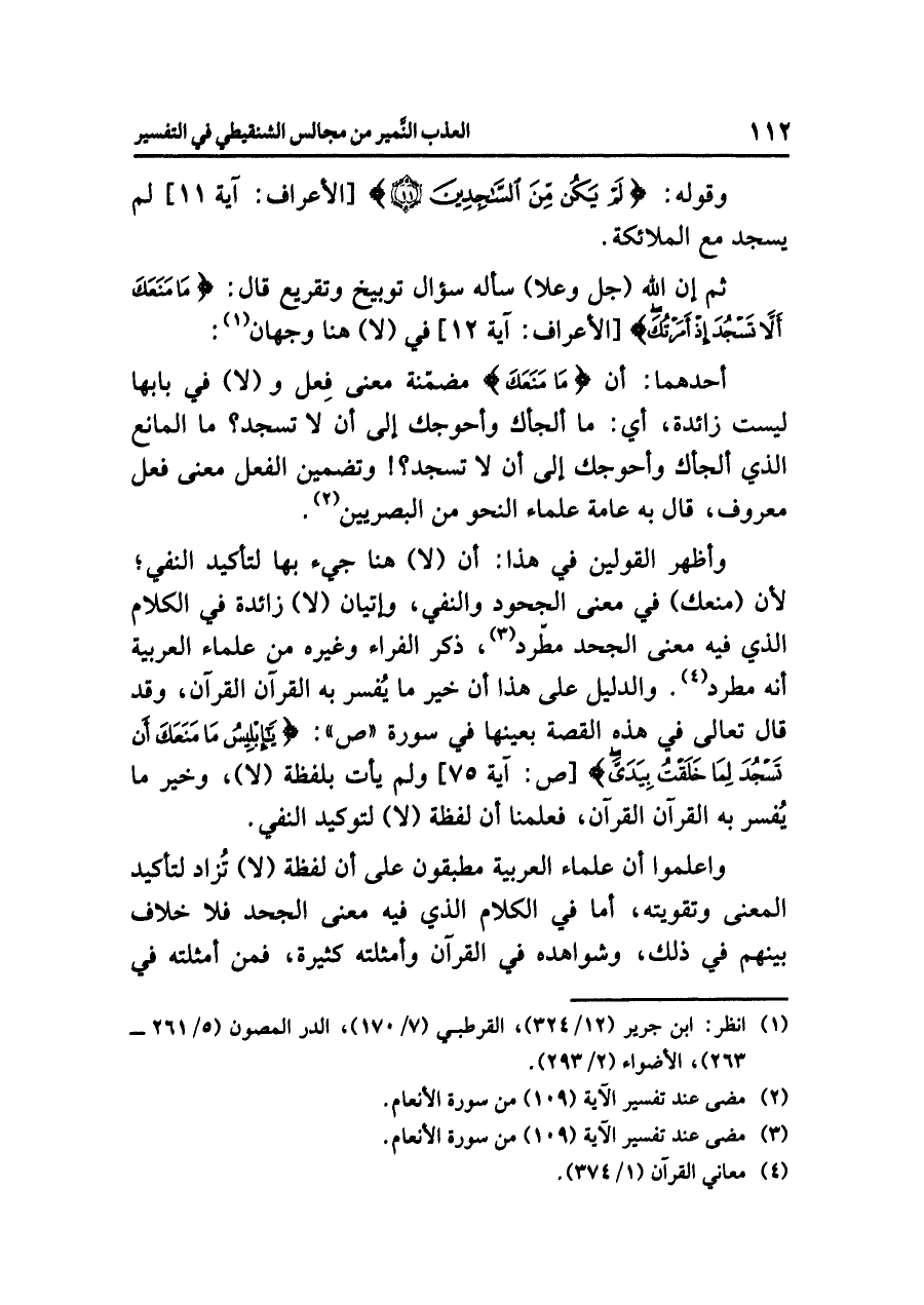 وقوله: {لَمْ يَكُن مِّنَ السَّاجِدِينَ} [الأعراف: آية ١١] لم يسجد مع الملائكة، ثم إن الله (جل وعلا) سأله سؤال توبيخ وتقريع قال: {مَا مَنَعَكَ أَلَاّ تسْجُدَ إِذْ أَمَرْتُكَ} [الأعراف: آية ١٢] في (لا) هنا وجهان (¬١):
