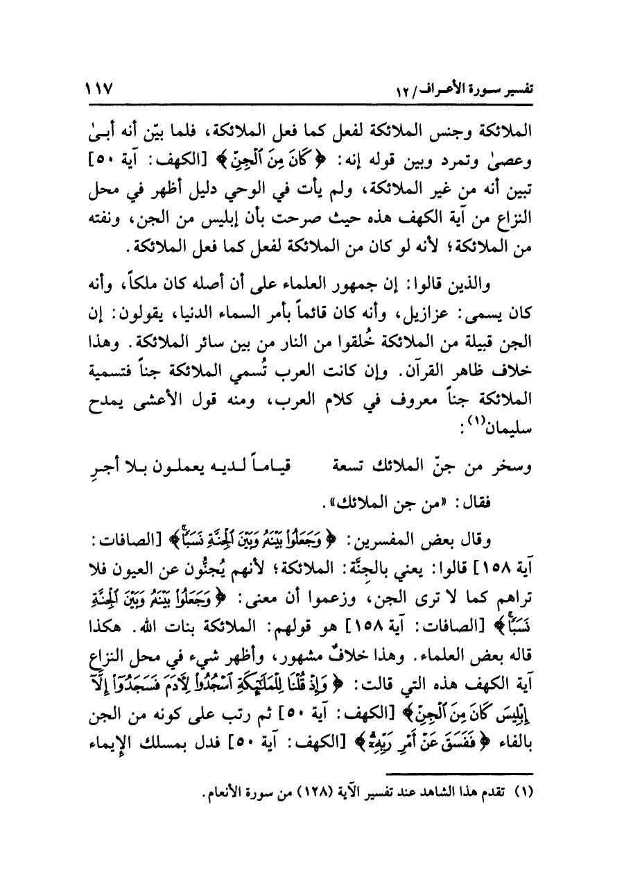 والذين قالوا: إن جمهور العلماء على أن أصله كان ملكاً، وأنه كان يسمى: عزازيل، وأنه كان قائماً بأمر السماء الدنيا، يقولون: إن الجن قبيلة من الملائكة خُلقوا من النار من بين سائر الملائكة، وهذا خلاف ظاهر القرآن، وإن كانت العرب تُسمي الملائكة جنّاً فتسمية الملائكة جنّاً معروف في كلام العرب، ومنه قول الأعشى يمدح سليمان (¬١):