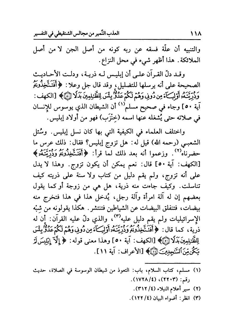 واختلف العلماء في الكيفية التي بها كان نسل إبليس، وسُئل الشعبي (رحمه الله) قيل له: هل تزوج إبليس؟ فقال: ذلك عرس ما حضرناه (¬٢). وزعموا أنه بعد ذلك لما قرأ: {أَفَتَتَّخِذُونَهُ وَذُرِّيَّتَهُ} [الكهف: آية ٥٠] قال: نعم يمكن أن يكون تزوج، وهذا لا يدل على أنه تزوج، ولم يقم دليل من كتاب ولا سنة على ذريته كيف تناسلت. وكيف جاءت منه ذرية، هل هي من زوجة أو كما يقول بعضهم إن له آلة امرأة وآلة رجل، يُدخل هذا في هذا فتخرج منه بيضات، فتنفلق البيضات عن الشياطين فتنتشر. هكذا يقولونه من شِبْه الإسرائيليات ولم يقم دليل عليه (¬٣)، والذي دلّ عليه القرآن: أن له ذرية، كما قال: {أَفَتَتَّخِذُونَهُ وَذُرِّيَّتَهُ أَوْلِيَاء مِن دُونِي وَهُمْ لَكُمْ عَدُوٌّ بِئْسَ لِلظَّالِمِينَ بَدَلاً} [الكهف: آية ٥٠] وهذا معنى قوله: {إِلَاّ إِبْلِيسَ لَمْ يَكُن مِّنَ السَّاجِدِينَ} [الأعراف: آية ١١].