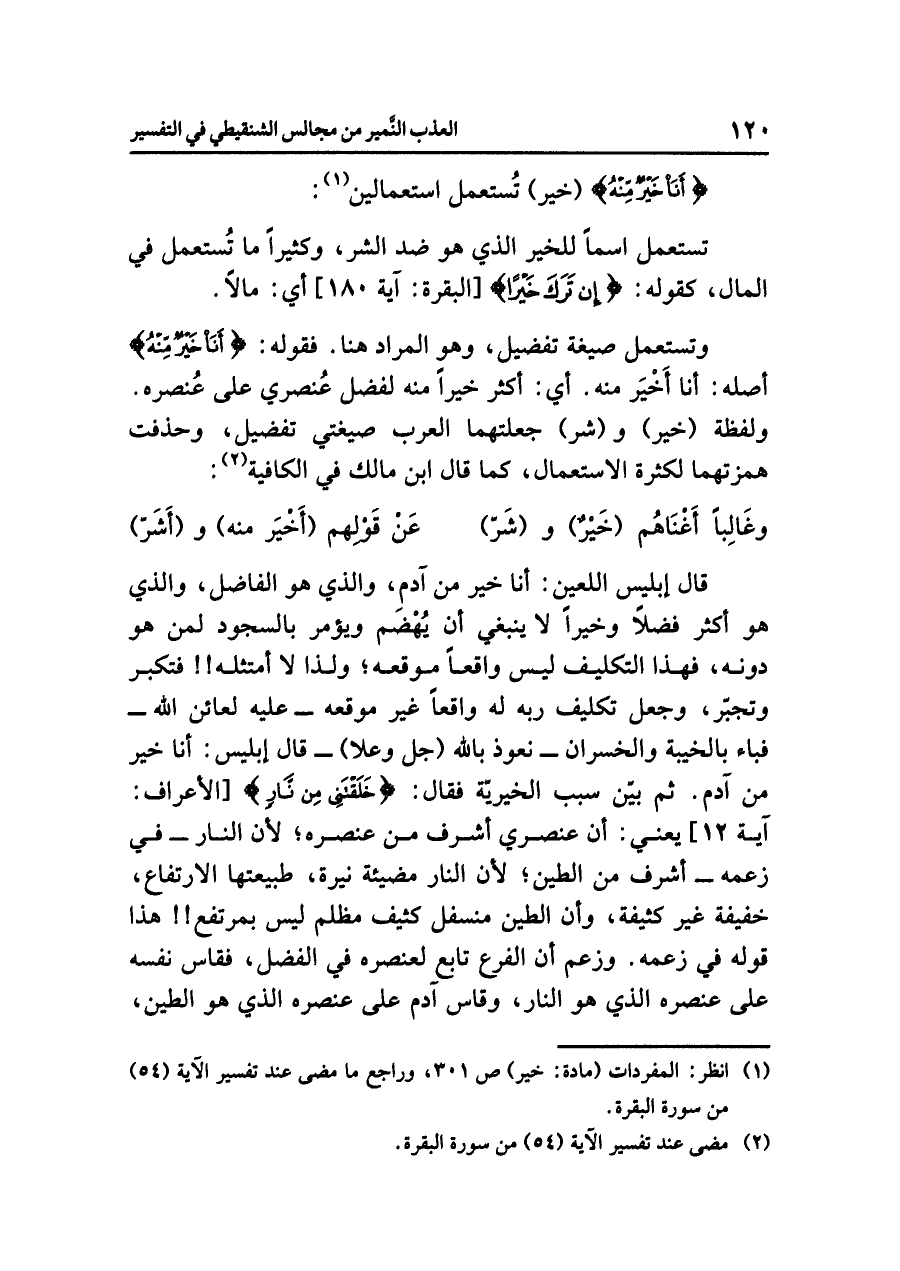 وتستعمل صيغة تفضيل، وهو المراد هنا. فقوله: {أَنَا خَيْرٌ مِّنْهُ} أصله: أنا أَخْيَر منه. أي: أكثر خيراً منه لفضل عُنصري على عُنصره. ولفظة (خير) و (شر) جعلتهما العرب صيغتي تفضيل، وحذفت همزتهما لكثرة الاستعمال، كما قال ابن مالك في الكافية (¬٢):