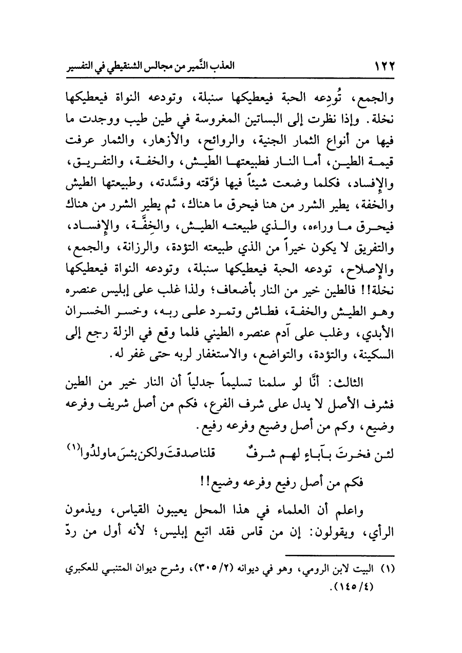 والجمع، تُودِعه الحبة فيعطيكها سنبلة، وتودعه النواة فيعطيكها نخلة، وإذا نظرت إلى البساتين المغروسة في طين طيب ووجدت ما فيها من أنواع الثمار الجنية، والروائح، والأزهار، والثمار عرفت قيمة الطين، أما النار فطبيعتها الطيش، والخفة، والتفريق، والإفساد، فكلما وضعت شيئاً فيها فرَّقته وفسَّدته، وطبيعتها الطيش والخفة، يطير الشرر من هنا فيحرق ما هناك، ثم يطير الشرر من هناك فيحرق ما وراءه، والذي طبيعته الطيش والخِفَّة والإفساد والتفريق لا يكون خيراً من الذي طبيعته التؤدة والرزانة والجمع والإصلاح، تودعه الحبة فيعطيكها سنبلة، وتودعه النواة فيعطيكها نخلة!! فالطين خير من النار بأضعاف؛ ولذا غلب على إبليس عنصره وهو الطيش والخفة، فطاش وتمرد على ربه، وخسر الخسران الأبدي، وغلب على آدم عنصره الطيني فلما وقع في الزلة رجع إلى السكينة والتؤدة والتواضع والاستغفار لربه حتى غفر له.