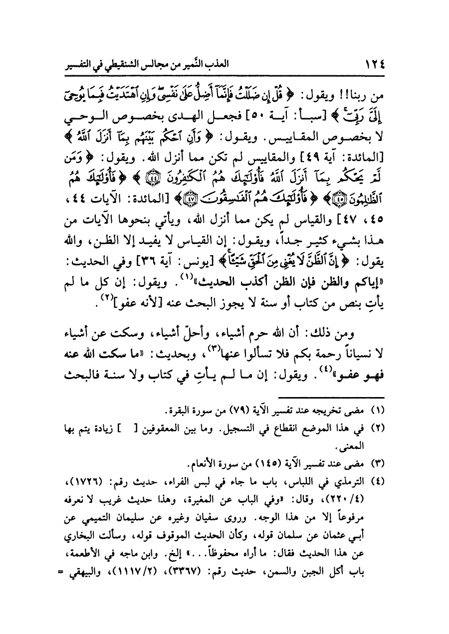 ويقول: {وَأَنِ احْكُم بَيْنَهُم بِمَا أَنزَلَ الله} [المائدة: آية ٤٩] والمقاييس لم تكن مما أنزل الله. ويقول: {وَمَن لَّمْ يَحْكُم بِمَا أَنزَلَ الله فَأُوْلَئِكَ هُمُ الْكَافِرُونَ} {فَأُوْلَئِكَ هُمُ الظَّالِمُونَ} {فَأُوْلَئِكَ هُمُ الْفَاسِقُونَ} [المائدة: الآيات ٤٤، ٤٥، ٤٧] والقياس لم يكن مما أنزل الله، ويأتي بنحوها الآيات من هذا بشيء كثير جدّاً، ويقول: إن القياس لا يفيد إلا الظن، والله يقول: {إِنَّ الظَّنَّ لَا يُغْنِي مِنَ الْحَقِّ شَيْئاً} [يونس: آية ٣٦] وفي الحديث: «إِيَّاكُمْ وَالظَّنَّ فَإِنَّ الظَّنَّ أَكْذَبُ الحَدِيثِ» (¬١). ويقول: إن كل ما لم يأتِ بنص من كتاب أو سنة لا يجوز البحث عنه [لأنه عفو] (¬٢).