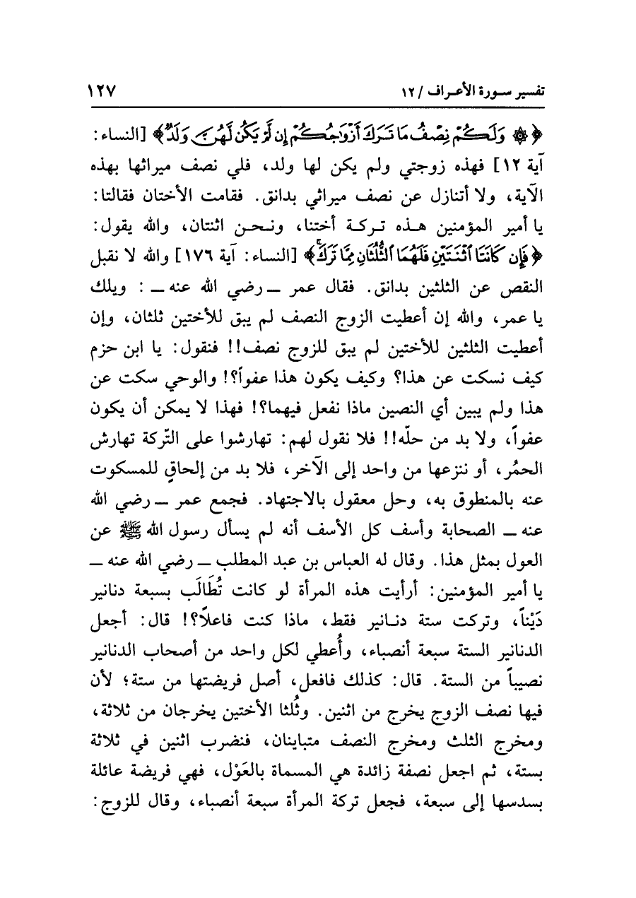 {وَلَكُمْ نِصْفُ مَا تَرَكَ أَزْوَاجُكُمْ إِن لَّمْ يَكُن لَّهُنَّ وَلَدٌ} [النساء: آية ١٢] فهذه زوجتي ولم يكن لها ولد، فَلِي نِصْف ميراثها بهذه الآية، ولا أتَنَازَل عن نصف ميراثي بدانق. فقامت الأختان فقالتا: يا أمير المؤمنين هذه تركة أختنا، ونحن اثنتان، والله يقول: {فَإِن كَانَتَا اثْنَتَيْنِ فَلَهُمَا الثُّلُثَانِ مِمَّا تَرَكَ} [النساء: آية ١٧٦] والله لا نقبل النقص عن الثلثين بدانق. فقال عمر -رضي الله عنه-: ويلك يا عمر، والله إن أعطيت الزوج النصف لم يبق للأختين ثلثان، وإن أعطيت الثلثين للأختين لم يبق للزوج نصف!! فنقول: يا ابن حزم كيف نسكت عن هذا؟ وكيف يكون هذا عفوًا؟! والوحي سكت عن هذا ولم يبين أيَّ النَّصَّيْنِ ماذا نفعل فيهما؟! فهذا لا يمكن أن يكون عفواً، ولا بد من حلّه!! فلا نقول لهم: تهارشوا على التّركة تهارش الحمُر، أو ننزعها من واحد إلى الآخر، فلا بد من إلحاقٍ للمسكوت عنه بالمنطوق به، وحل معقول بالاجتهاد. فجمع عمر -رضي الله عنه- الصحابة، وأسف كل الأسف أنه لم يسأل رسول الله صلى الله عليه وسلم عن العول بمثل هذا، وقال له العباس بن عبد المطلب -رضي الله عنه-: يا أمير المؤمنين، أرأيت هذه المرأة لو كانت تُطَالَب بسبعة دنانير دَيْناً، وتركت ستة دنانير فقط، ماذا كنت فاعلاً؟! قال: أجعل الدنانير الستة سبعة أنصباء، وأُعطي لكل واحد من أصحاب الدنانير نصيباً من الستة. قال: كذلك فافعل، أصل فريضتها من ستة؛ لأن فيها نصف الزوج يخرج من اثنين. وثُلثا الأختين يخرجان من ثلاثة، ومخرج الثلث ومخرج النصف متباينان، فنضرب اثنين في ثلاثة بستة، ثم اجْعَل نَصْفَة زائدة هي المسماة بالعَوْل، فهي فريضة عائلة بسدسها إلى سبعة، فجعل تركة المرأة سبعة أنصباء، وقال للزوج: