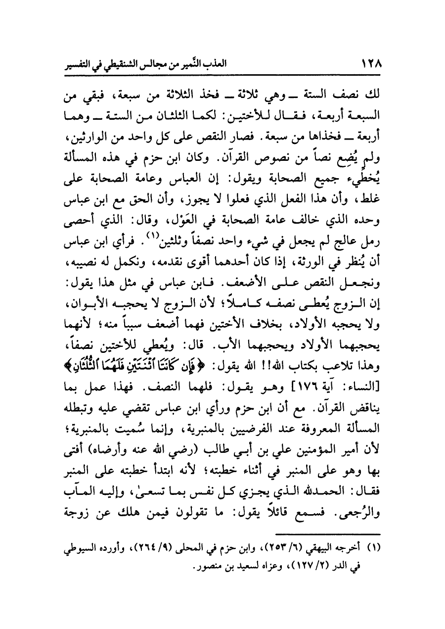 فصار النقص على كل واحد من الوارثين، ولم يُضِع نصّاً من نصوص القرآن. وكان ابن حزم في هذه المسالة يُخطِّيء جميع الصحابة ويقول: إن العباس وعامة الصحابة على غلط، وأن هذا الفعل الذي فعلوا لا يجوز، وأن الحق مع ابن عباس وَحْدَه الذي خالف عامة الصحابة في العَوْل، وقال: الذي أحصى رمل عالج لم يجعل في شيء واحد نصفاً وثلثين (¬١). فرأي ابن عباس أن يُنظر في الورثة، إذا كان أحدهما أقْوَى نُقَدِّمُه، ونكمل له نصيبه، ونجعل النقص على الأضعف، فابن عباس في مثل هذا يقول: إن الزوج يُعطى نصفه كاملاً؛ لأن الزوج لا يحجبه الأبوان، ولا يحجبه الأولاد، بخلاف الأختين فهما أضعف سبباً منه؛ لأنهما يحجبهما الأولاد ويحجبهما الأب. قال: وُيعطي للأختين نصفاً، وهذا تلاعب بكتاب الله!! الله يقول: {فَإِن كَانَتَا اثْنَتَيْنِ فَلَهُمَا الثُّلُثَانِ} [النساء: آية ١٧٦] وهو يقول: فلهما النصف. فهذا عمل بما يناقض القرآن. مع أن ابن حزم ورأي ابن عباس تقضي عليه وتبطله المسألة المعروفة عند الفرضيين بالمنبرية، وإنما سُميت بالمنبرية؛ لأن أمير المؤمنين علي بن أبي طالب (رضي الله عنه وأرضاه) أفتى بها وهو على المنبر في أثناء خطبته؛ لأنه ابتدأ خطبته على المنبر فقال: الحمد لله الذي يجزي كل نفس بما تسعى، وإليه المآب والرُّجعى. فسمع قائلاً يقول: ما تقولون فيمن هلك عن زوجة