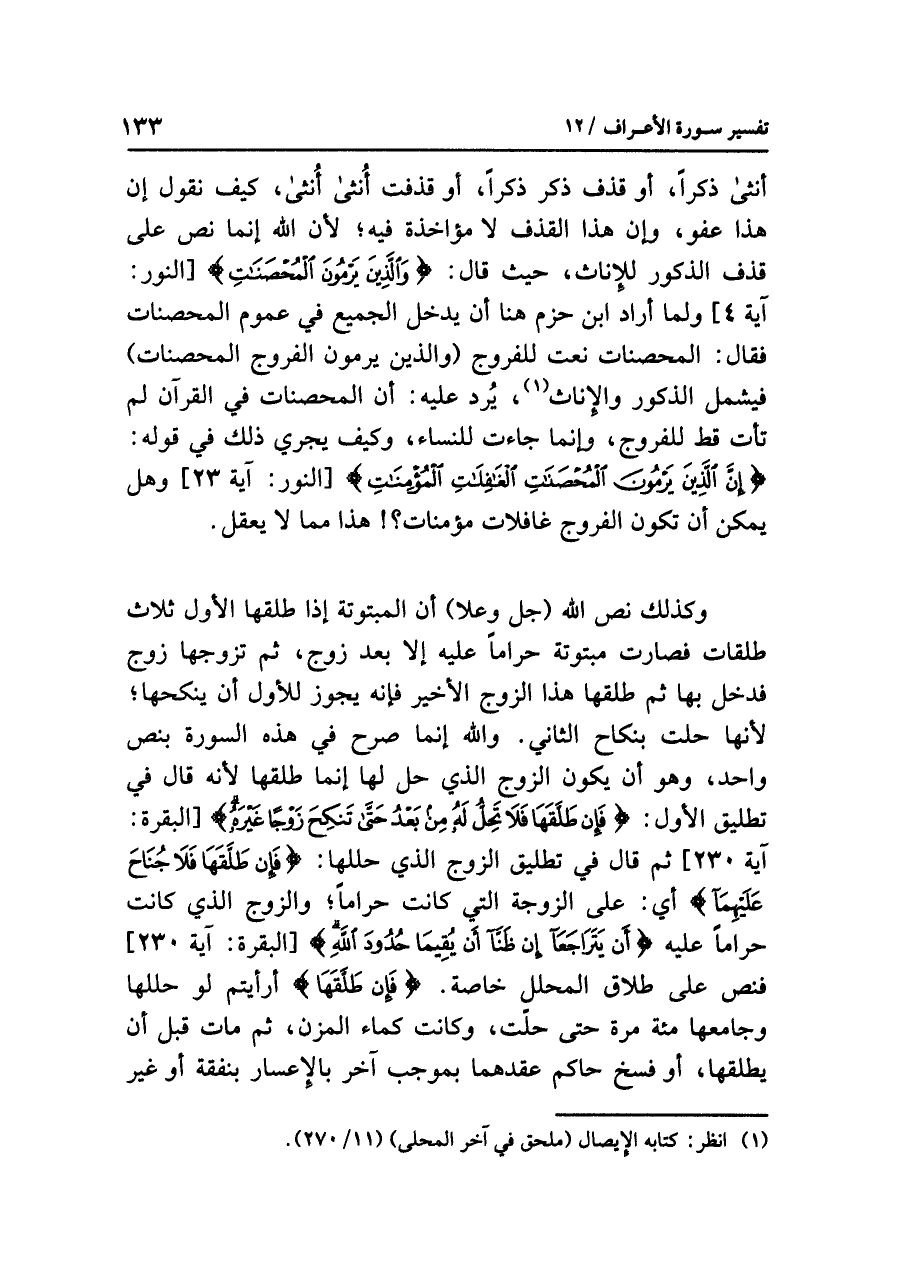 أنثى ذكراً، أو قذف ذكر ذكراً، أو قذفت أُنثى أُنثى، كيف نقول إن هذا عفو، وإن هذا القذف لا مؤاخذة فيه؛ لأن الله إنما نص على قذف الذكور للإناث، حيث قال: {وَالَّذِينَ يَرْمُونَ الْمُحْصَنَاتِ} [النور: آية ٤] ولما أراد ابن حزم هنا أن يدخل الجميع في عموم المحصنات فقال: المحصنات نعت للفروج (والذين يرمون الفروج المحصنات) فيشمل الذكور والإناث (¬١)، يُرد عليه: أن المحصنات في القرآن لم تأتِ قط للفروج، وإنما جاءت للنساء، وكيف يجري ذلك في قوله: {إِنَّ الَّذِينَ يَرْمُونَ الْمُحْصَنَاتِ الْغَافِلَاتِ الْمُؤْمِنَاتِ} [النور: آية ٢٣] وهل يمكن أن تكون الفروج غافلات مؤمنات؟! هذا مما لا يعقل.
