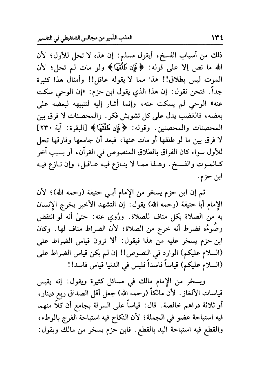 ذلك من أسباب الفسخ، أيقول مسلم: إن هذه لا تحل للأول؛ لأن الله ما نص إلا على قوله: {فَإِن طَلَّقَهَا} ولو مات لم تحل؛ لأن الموت ليس بطلاق!! هذا مما لا يقوله عاقل!! وأمثال هذا كثيرة جدّاً. فنحن نقول: إن هذا الذي يقول ابن حزم: «إن الوحي سكت عنه» الوحي لم يسكت عنه، وإنما أشار إليه لتنبيهه لبعضه على بعضه، فالغضب يدل على كل تشويش فكر. والمحصنات لا فرق بين المحصنات والمحصنين. وقوله: {فَإِن طَلَّقَهَا} [البقرة: آية ٢٣٠] لا فرق بين ما لو طلقها أو مات عنها، فَبَعْدَ أنْ جَامَعَهَا وفارَقَهَا تَحِلّ للأَوَّلِ سواء كان الفراق بالطلاق المنصوص في القرآن، أو بسبب آخر كالموت والفَسْخِ. وهذا مما لا ينازع فيه عاقل، وإن نازع فيه ابن حزم.