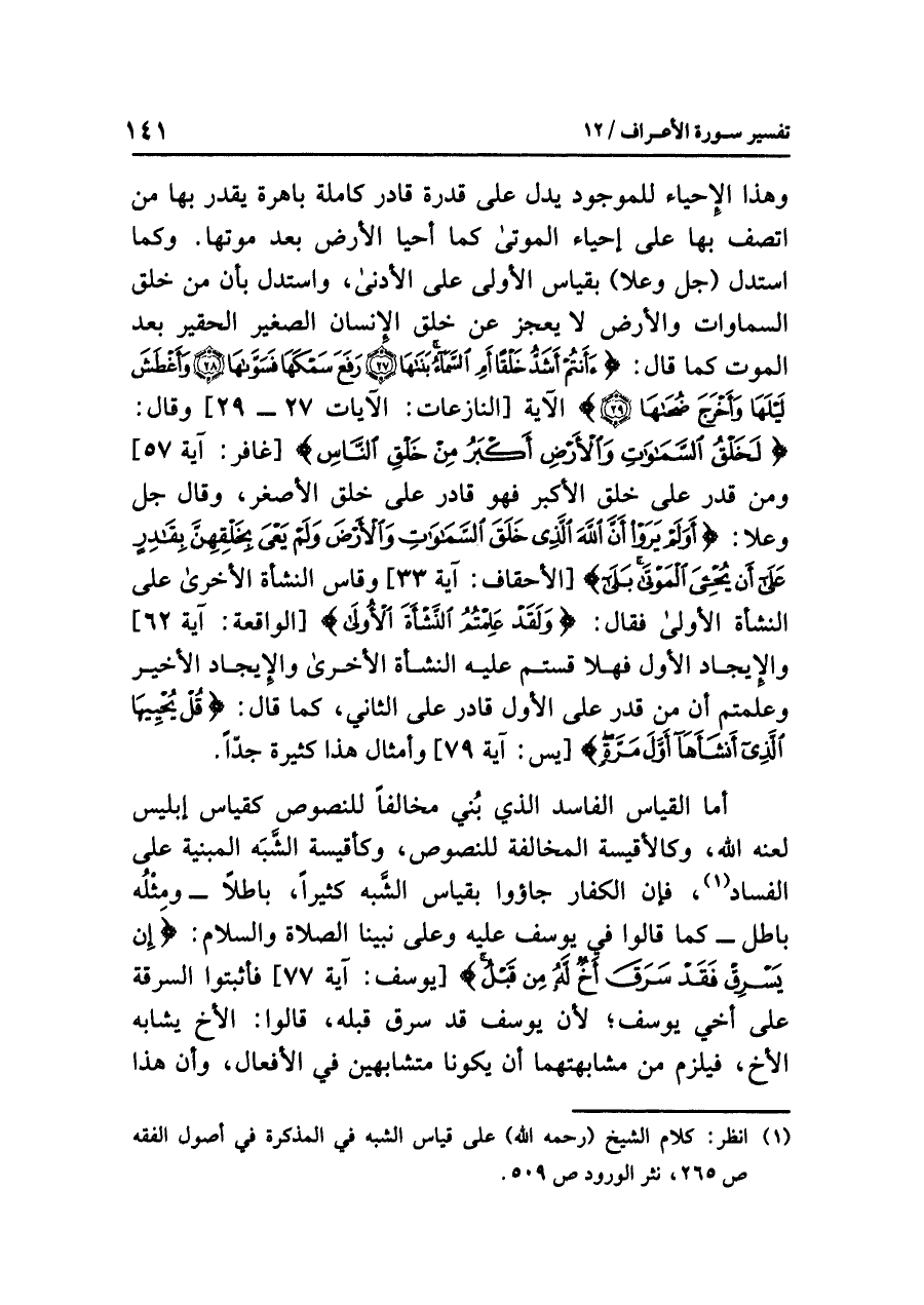 وهذا الإحياء للموجود يدل على قدرة قادر كاملة باهرة يقدر بها من اتصف بها على إحياء الموتى كما أحيا الأرض بعد موتها، وكما استدل (جل وعلا) بقياس الأولى على الأدنى، واستدل بأن من خلق السماوات والأرض لا يعجز عن خلق الإنسان الصغير الحقير بعد الموت، كما قال: {أَأَنتُمْ أَشَدُّ خَلْقاً أَمِ السَّمَاء بَنَاهَا (٢٧) رَفَعَ سَمْكَهَا فَسَوَّاهَا (٢٨) وَأَغْطَشَ لَيْلَهَا وَأَخْرَجَ ضُحَاهَا (٢٩)} الآية [النازعات: الآيات ٢٧ - ٢٩] وقال: {لَخَلْقُ السَّمَاوَاتِ وَالْأَرْضِ أَكْبَرُ مِنْ خَلْقِ النَّاسِ} [غافر: آية ٥٧]، ومن قدر على خلق الأكبر فهو قادر على خلق الأصغر، وقال جل وعلا: {أَوَلَمْ يَرَوْا أَنَّ الله الَّذِي خَلَقَ السَّمَاوَاتِ وَالْأَرْضَ وَلَمْ يَعْيَ بِخَلْقِهِنَّ بِقَادِرٍ عَلَى أَنْ يُحْيِيَ الْمَوْتَى بَلَى} [الأحقاف: آية ٣٣] وقاس النشأة الأخرى على النشأة الأولى فقال: {وَلَقَدْ عَلِمْتُمُ النَّشْأَةَ الْأُولَى} [الواقعة: آية ٦٢] والإيجاد الأول، فهلا قستم عليه النشأة الأخرى والإيجاد الأخير، وعلمتم أن مَنْ قَدَر على الأول قادر على الثاني، كما قال: {قُلْ يُحْيِيهَا الَّذِي أَنشَأَهَا أَوَّلَ مَرَّةٍ} [يس: آية ٧٩] وأمثال هذا كثيرة جدّاً.