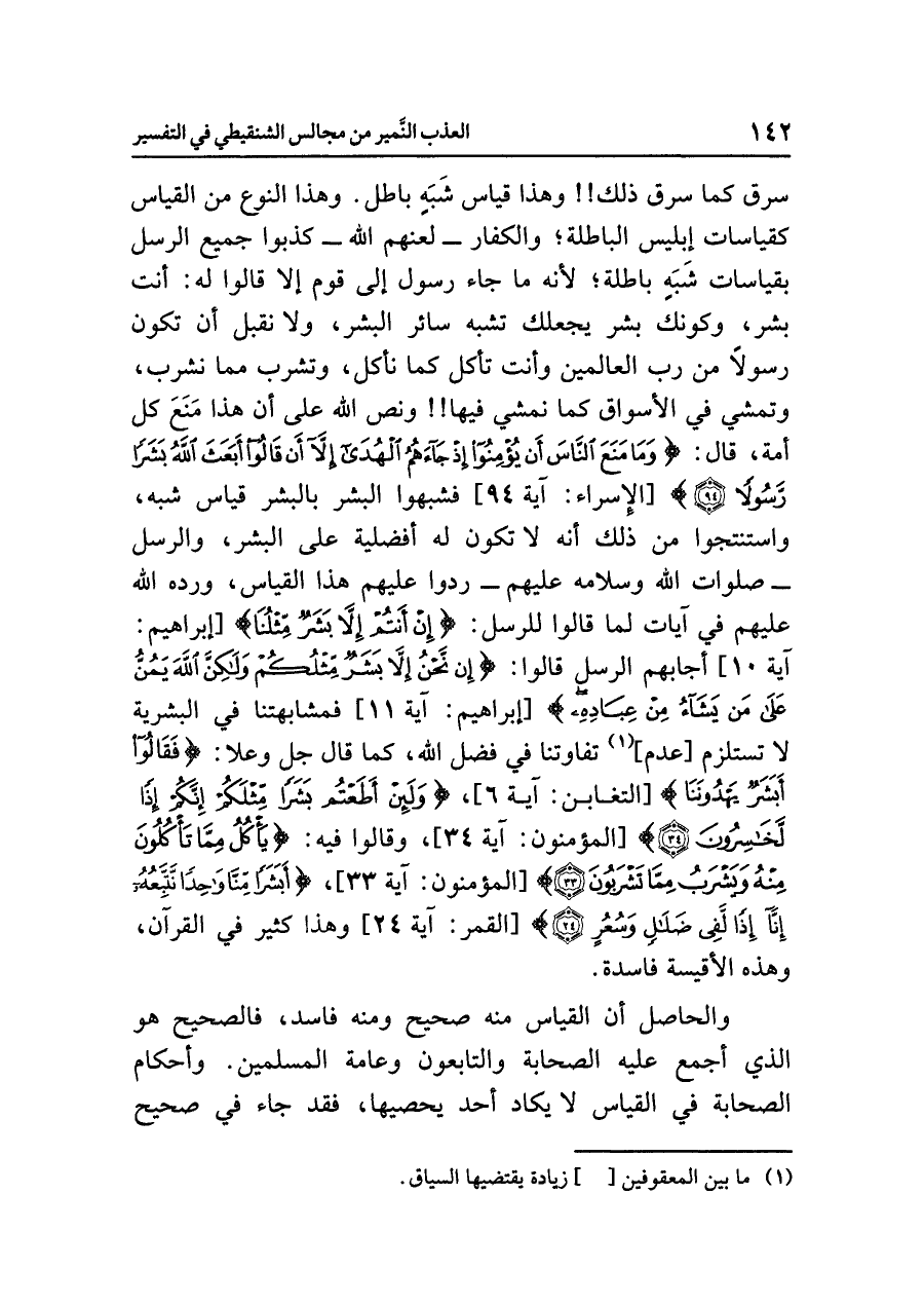 سرق كما سرق ذلك!! وهذا قياس شَبَهٍ باطل. وهذا النوع من القياس كقياسات إبليس الباطلة؛ والكفار - لعنهم الله - كذبوا جميع الرسل بقياسات شَبَهٍ باطلة؛ لأنه ما جاء رسول إلى قوم إلا قالوا له: أنت بشر، وكونك بشر يجعلك تشبه سائر البشر، ولا نقبل أن تكون رسولاً من رب العالمين وأنت تأكل كما نأكل، وتشرب مما نشرب، وتمشي في الأسواق كما نمشي فيها!! ونص الله على أن هذا مَنَعَ كل أمة، قال: {وَمَا مَنَعَ النَّاسَ أَن يُؤْمِنُواْ إِذْ جَاءهُمُ الْهُدَى إِلَاّ أَن قَالُواْ أَبَعَثَ اللهُ بَشَراً رَّسُولاً (٩٤)} [الإسراء: آية ٩٤] فشبهوا البشر بالبشر قياس شبه، واستنتجوا من ذلك أنه لا تكون له أفضلية على البشر، والرسل - صلوات الله وسلامه عليهم - ردوا عليهم هذا القياس، ورده الله عليهم في آيات لما قالوا للرسل: {إِنْ أَنتُمْ إِلَاّ بَشَرٌ مِّثْلُنَا} [إبراهيم: آية ١٠] أجابهم الرسل قالوا: {إِن نَّحْنُ إِلَاّ بَشَرٌ مِّثْلُكُمْ وَلَكِنَّ اللهَ يَمُنُّ عَلَى مَن يَشَاءُ مِنْ عِبَادِهِ} [إبراهيم: آية ١١] فمشابهتنا في البشرية لا تستلزم [عدم] (¬١)