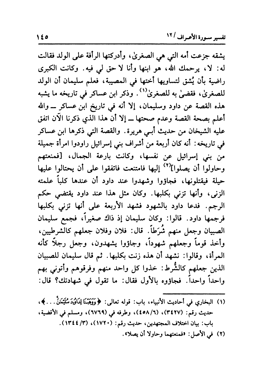 يشقه جزعت أمه التي هي الصغرى، وأدركتها الرأفة على الولد فقالت له: لا، يرحمك الله، هو ابنها وأنا لا حق لي فيه. وكانت الكبرى راضية بأن يُشق لتساويها أختها في المصيبة، فعلم سليمان أن الولد للصغرى، فقضى به للصغرى (¬١). وذكر ابن عساكر في تاريخه ما يشبه هَذِهِ القِصَّةَ عَنْ دَاوُد وسليمان، إلا أَنَّهُ فِي تاريخ ابن عساكر -والله أعلم بصحة القصة وعدم صحتها- إلا أن هذا الذي ذكرنا الآن اتفق عليه الشيخان من حديث أبي هريرة. والقصة التي ذَكَرَها ابن عساكر في تاريخه: أنه كان أربعة من أشراف بني إسرائيل راودوا امرأة جميلة من بني إسرائيل عن نفسها، وكانت بارعة الجمال، [فمنعتهم وحاولوا أن يصلوا] (¬٢) إليها فامتنعت، فاتفقوا على أن يحتالوا عليها حيلة فيقتلونها، فجاءوا وشهدوا عند داود أن عندها كلباً علمته الزنا، وأنها تزني بكلبها، وكان مثل هذا عند داود يقتضي حكم الرجم، فدعا داود بالشهود فشهد الأربعة على أنها تزني بكلبها فرجمها داود.