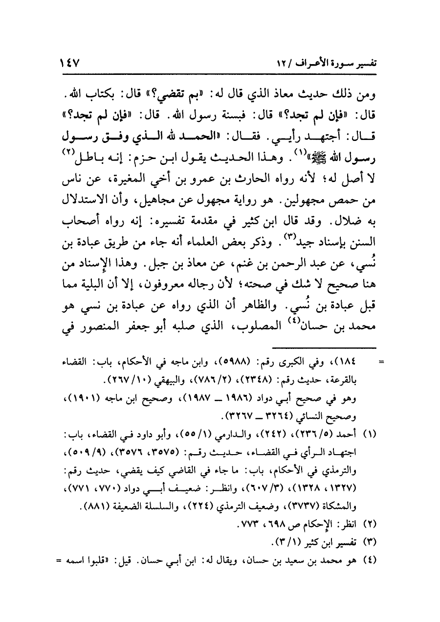 ومن ذلك حديث معاذ الذي قال له: «بِمَ تَقْضِي؟» قال: بكتاب الله. قال: «فإنْ لَمْ تَجِدْ؟» فبسنة رسول الله. قال: «فَإِنْ لَمْ تَجِدْ؟» قال: أجْتَهِدُ رَأْيِي. فقال: «الحَمْدُ للهِ الَّذِي وَفَّقَ رَسُولَ رَسُولِ اللهِ صَلَّى اللهُ عَلَيْهِ وَسَلَّمَ» (¬١). وهذا الحديث يقول ابن حزم: إنه باطل (¬٢) لا أصل له؛ لأنه رواه الحارث بن عمرو ابن أخي المغيرة، عن ناس من حمص مجهولين، هو رواية مجهول عن مجاهيل، وأن الاستدلال به ضلال. وقد قال ابن كثير في مقدمة تفسيره: إنه رواه أصحاب السنن بإسناد جيد (¬٣) وذكر بعض العلماء أنه جاء من طريق عبادة بن نُسي، عن عبد الرحمن بن غنم، عن معاذ بن جبل. وهذا الإسناد من هنا صحيح لا شك في صحته؛ لأن رجاله معروفون، إلا أن البلية مما قبل عبادة بن نُسي، والظاهر أن الذي رواه عن عبادة بن نسي هو محمد بن حسان (¬٤) المصلوب، الذي صلبه أبو جعفر المنصور في