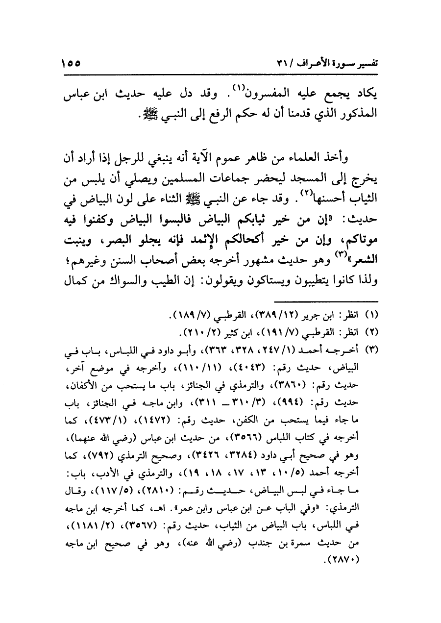 وأخذ العلماء من ظاهر عموم الآية أنَّهُ يَنْبَغِي للرجل إذا أراد أن يخرج إلى المسجد ليحضر جماعات المسلمين ويصلي أن يلبس من الثياب أحْسَنَها (¬٢). وقد جاء عن النبي صلى الله عليه وسلم الثناء على لَوْنِ البَيَاض في حديث: «إِنَّ مِنْ خَيْرِ ثِيَابِكُمُ الْبَيَاضَ فَالْبَسُوا الْبَيَاضَ وَكَفِّنُوا فِيهِ مَوْتَاكُمْ، وَإِنَّ مِنْ خَيْرِ أَكْحَالِكُمُ الإِثْمِدَ فَإِنَّهُ يَجْلُو الْبَصَرَ، وَيُنْبِتُ الشَّعَرَ» (¬٣) وهو حديث مشهور أخرجه بعض أصحاب السنن وغيرهم؛ ولذا كانوا يتطيبون ويستاكون ويقولون: إن الطيب والسواك مِنْ كَمَالِ