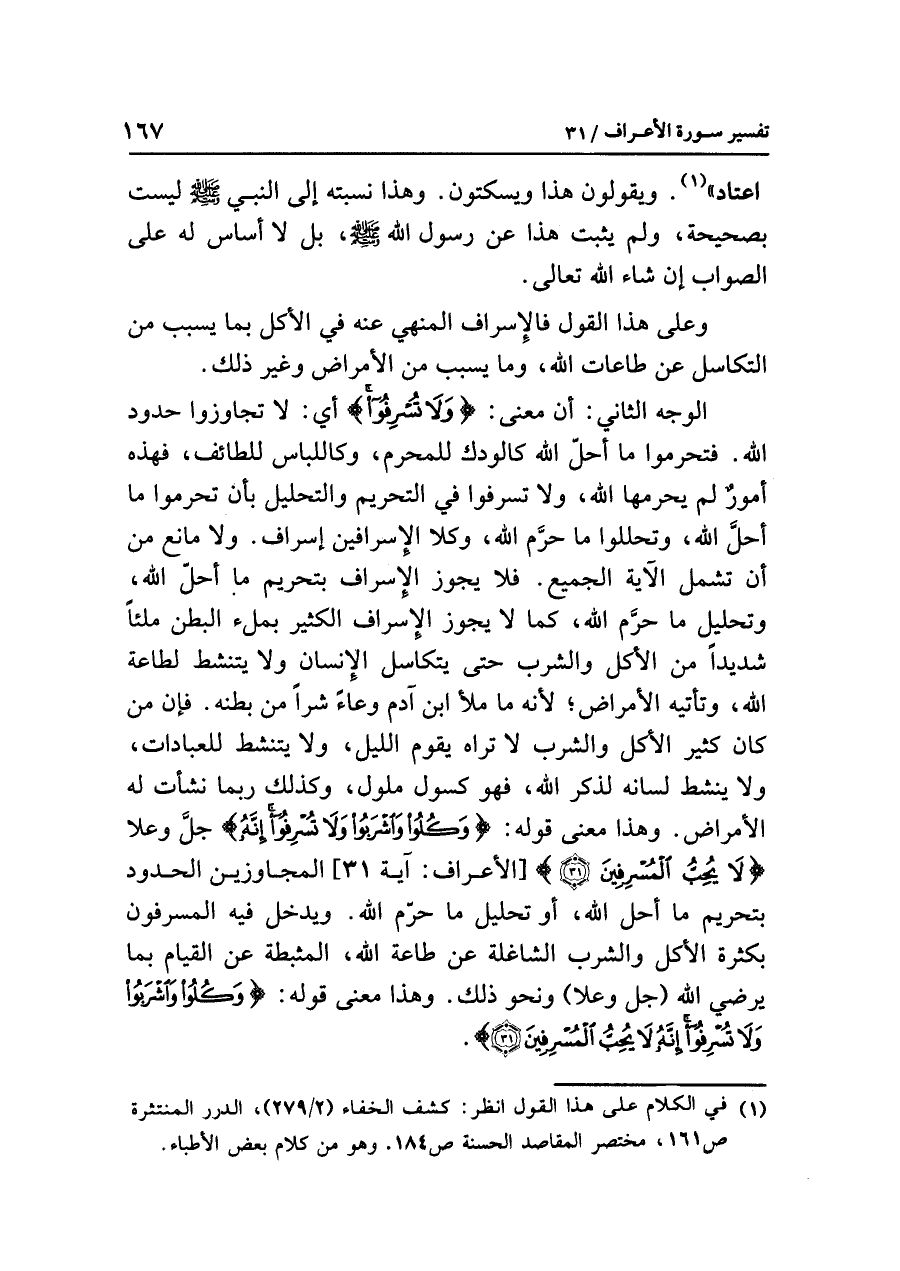 الوجه الثاني؛ أن معنى: {وَلَا تُسْرِفُواْ} أي: لا تجاوزوا حدود الله، فتحرِّمُوا ما أحلّ الله كالودك للمُحْرِم، وكاللباس للطَّائِف، فهذه أمورٌ لم يحرمها الله، ولا تسرفوا في التحريم والتحليل بأن تحرموا ما أحلَّ الله، وتحللوا ما حرَّم الله، وكلا الإسرافين إسراف. ولا مانع من أن تشمل الآية الجميع. فلا يجوز الإسراف بتحريم ما أحلَّ الله، وتحليل ما حرَّم الله، كما لا يجوز الإسراف الكثير بملء البطن مِلْئاً شديداً من الأكل والشرب حتى يتكاسل الإنسان ولا يتنشط لطاعة الله، وتأتيه الأمْرَاض؛ لأنه ما ملأ ابن آدم وعاءً شرّاً مِنْ بَطْنِهِ؛ فَإِنَّ مَنْ كَانَ كَثِيرَ الأكْلِ والشُّرْبِ لا تراه يقوم الليل، ولا يتنشط للعبادات، ولا ينشط لسانه لذكر الله، فهو كسول ملول، وكذلك ربما نشأت له الأمراض. وهذا معنى قوله: {وكُلُواْ وَاشْرَبُواْ وَلَا تُسْرِفُواْ إِنَّهُ} جلَّ وعلا {لَا يُحِبُّ الْمُسْرِفِينَ} [الأعراف: آية ٣١] المُجَاوِزِينَ الحدود بتحريم ما أحل الله، أو تحليل ما حرّم الله. ويدخل فيه المسرفون بكثرة الأكل والشرب الشاغلة عن طاعة الله، المثبطة عن القيام بِمَا يُرْضِي اللهَ (جل وعلا) ونحو ذلك، وهذا معنى قَوْلِهِ: {وكُلُواْ وَاشْرَبُواْ وَلَا تُسْرِفُواْ إِنَّهُ لَا يُحِبُّ الْمُسْرِفِينَ}.