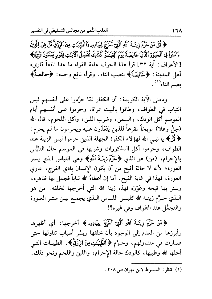 ومعنى الآية الكريمة: أن الكفار لمّا حرَّموا على أنفسهم لبس الثياب في الطواف، وطافوا بالبيت عُرَاةً، وحرَّمُوا على أنفسهم أيام الموسم أكل الودك، والسمن، وشرب اللبن، وأكل اللحوم، قال الله (جلَّ وعلا) موبِّخاً مقرعاً للذين يَتَعَدَّون عليه ويحرمون ما لم يحرم: {قُلْ} يا نبي الله لهؤلاء الكفرة الجهلة الذين حَرَّمُوا لبس الزينة عند الطواف، وحرموا أكل المذكورات وشربها في الموسم حال التلبُّس بالإحرام، (من) هو الذي {حَرَّمَ زِينَةَ الله} وهي اللباس الذي يستر العورة؛ لأنه لا حالة أقبح مِنْ أَنْ يَكُونَ الإِنْسَان بادِي الفرج، عاري العورة، فهذا في غاية القبح. أما إن أعطاهُ الله ثياباً فجمل بها ظاهره، وستر بها قبحه وعَوَرَه فهذه زينة الله التي أخرجها لخلقه. من هو الذي حرَّم زينة الله كلبس اللباس الذي يجمع بين ستر العورة والتجمُّل عند الطواف وفي غيره؟!