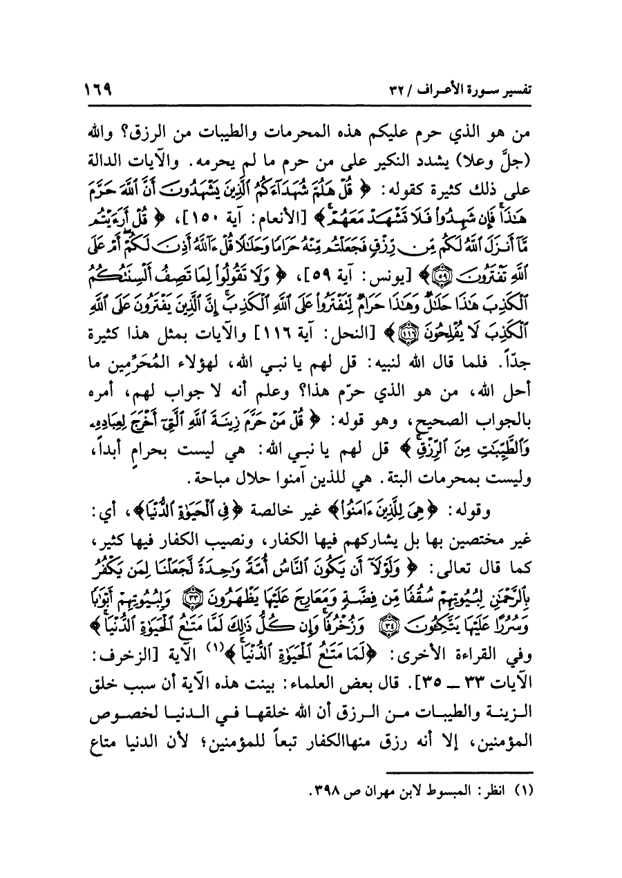 من هو الذي حرم عليكم هذه المحرمات والطيبات من الرزق؟ والله (جلَّ وعلا) يشدد النكير على من حرم ما لم يحرمه. والآيات الدالة على ذلك كثيرة كقوله: {قُلْ هَلُمَّ شُهَدَاءكُمُ الَّذِينَ يَشْهَدُونَ أَنَّ الله حَرَّمَ هَذَا فَإِن شَهِدُواْ فَلَا تَشْهَدْ مَعَهُمْ} [الأنعام: آية ١٥٠] {قُلْ أَرَأَيْتُم مَّا أَنزَلَ اللهُ لَكُم مِّن رِّزْقٍ فَجَعَلْتُم مِّنْهُ حَرَاماً وَحَلَالاً قُلْ آللهُ أَذِنَ لَكُمْ أَمْ عَلَى اللهِ تَفْتَرُونَ (٥٩)} [يونس: آية ٥٩] {وَلَا تَقُولُواْ لِمَا تَصِفُ أَلْسِنَتُكُمُ الْكَذِبَ هَذَا حَلَالٌ وَهَذَا حَرَامٌ لِّتَفْتَرُواْ عَلَى اللهِ الْكَذِبَ إِنَّ الَّذِينَ يَفْتَرُونَ عَلَى اللهِ الْكَذِبَ لَا يُفْلِحُونَ (١١٦)} [النحل: آية ١١٦] والآيات بمثل هذا كثيرة جدّاً. فلما قال الله لنبيه: قل لهم يا نبي الله، لهؤلاء المُحَرِّمِين ما أحل الله، من هو الذي حَرَّمَ هذا؟ وعلم أنه لا جواب لهم، أمره بالجواب الصحيح، وهو قوله: {قُلْ مَنْ حَرَّمَ زِينَةَ الله الَّتِيَ أَخْرَجَ لِعِبَادِهِ وَالْطَّيِّبَاتِ مِنَ الرِّزْقِ} قل لهم يا نبي الله: هي ليست بحرامٍ أبداً، وليست بمحرمات ألبتة. هي للذين آمنوا حلال مباحة.
