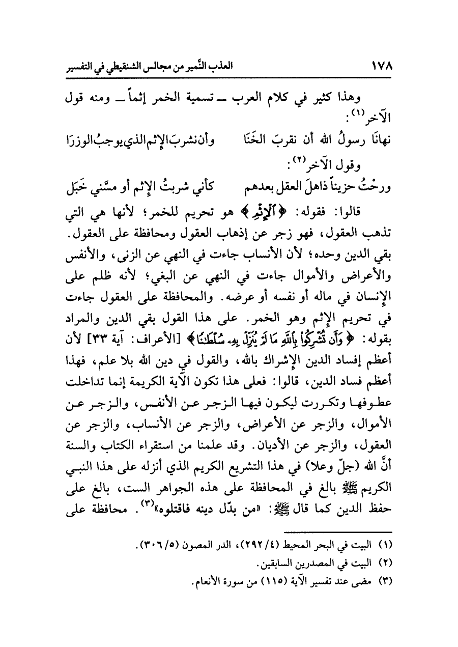 قالوا: فقوله: {الإِثْمَ} هو تحريم للخمر؛ لأنها هي التي تذهب العقول، فهو زجر عن إذهاب العقول ومحافظة على العقول. بقي الدين وحده؛ لأن الأنساب جاءت في النهي عن الزنا، والأنفس والأعراض والأموال جاءت في النهي عن البغي؛ لأنه ظلم على الإنسان في ماله أو نفسه أو عرضه. والمحافظة على العقول جاءت في تحريم الإثم وهو الخمر. على هذا القول بقي الدين والمراد بقوله: {وَأَن تُشْرِكُواْ بِالله مَا لَمْ يُنَزِّلْ بِهِ سُلْطَاناً} [الأعراف: آية ٣٣] لأن أعظم إفساد الدين الإشراك بالله، والقول في دين الله بلا علم، فهذا أعظم فساد الدين، قالوا: فعلى هذا تكون الآية الكريمة إنما تداخلت عطوفها وتكرَّرَتْ ليكون فيها الزَّجْرُ عن الأنفس، والزجر عن الأموال، والزجر عن الأعراض، والزجر عن الأنساب، والزجر عن العقول، والزجر عن الأديان. وقد علمنا من استقراء الكتاب والسنة أن الله (جل وعلا) في هذا التشريع الكريم الذي أنْزَلَهُ عَلَى هذا النبي الكريم صلى الله عليه وسلم بالغ في المُحَافَظَةِ على هذه الجواهر الست، بالغ على حفظ الدين كما قال صلى الله عليه وسلم: «مَنْ بَدَّلَ دِينَهُ فَاقْتُلُوهُ» (¬٣)؛ محافظة على