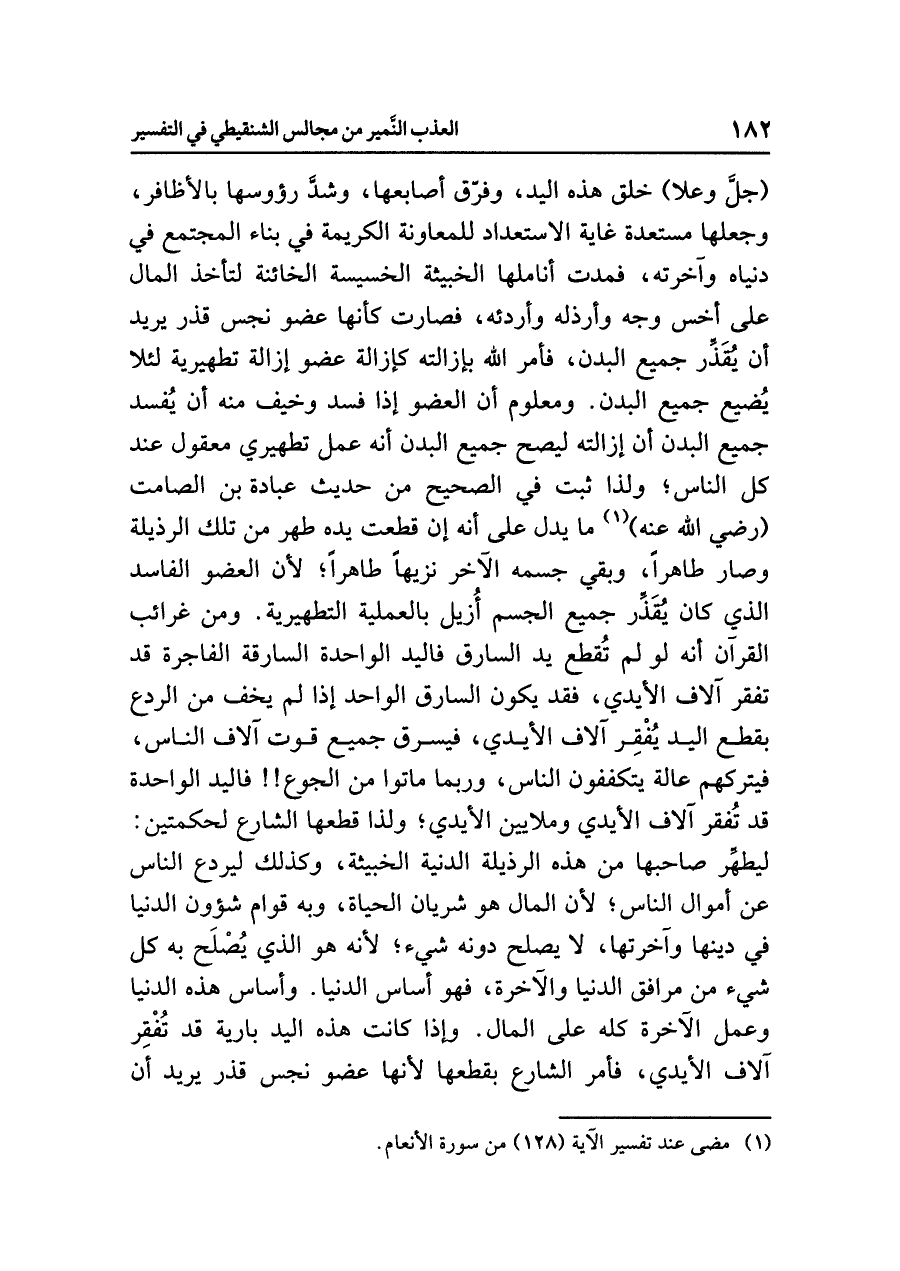 (جلَّ وعلا) خلق هذه اليد، وفرّق أصابعها، وشدَّ رؤوسها بالأظافر، وجعلها مستعدة غاية الاستعداد للمعاونة الكريمة في بناء المجتمع في دنياه وآخرته، فمدت أناملها الخبيثة الخسيسة الخائنة لتأخذ المال على أخس وجه وأرذله وأردئه، فصارت كأنها عضو نجس قذر يريد أن يُقَذِّر جميع البدن، فأمر الله بإزالته كإزالة عضو إزالة تطهيرية لئلا يُضيع جميع البدن. ومعلوم أن العضو إذا فسد وخيف منه أن يُفسد جميع البدن أن إزالته ليصح جميع البدن أنه عمل تطهيري معقول عند كل الناس؛ ولذا ثبت في الصحيح من حديث عبادة بن الصامت (رضي الله عنه) (¬١) ما يدل على أنه إن قطعت يده طهر من تلك الرذيلة وصار طاهراً، وبقي جسمه الآخر نزيهاً طاهراً؛ لأن العضو الفاسد الذي كان يُقَذِّر جميع الجسم أُزيل بالعملية التطهيرية.