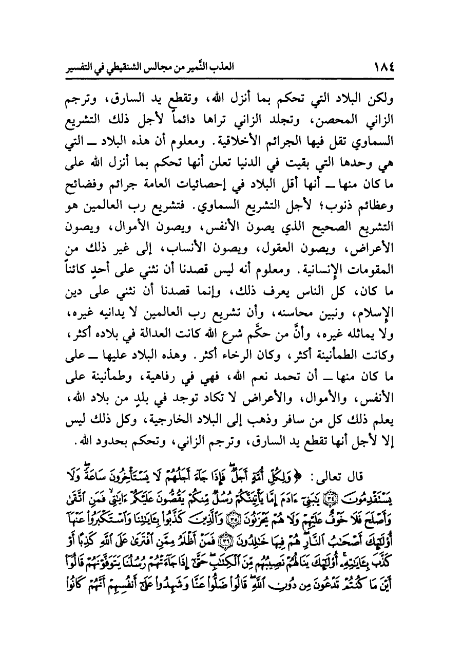 ولكن البلاد التي تحكم بما أنزل الله، وتقطع يد السارق، وترجم الزاني المحصن، وتجلد الزاني تراها دائماً لأجل ذلك التشريع السماوي تقل فيها الجرائم الأخلاقية. ومعلوم أن هذه البلاد - التي هي وحدها التي بقيت في الدنيا تعلن أنها تحكم بما أنزل الله على ما كان منها - أنها أقل البلاد في الإحصائيات العامة جرائم وفضائح وعظائم ذنوب؛ لأجل التشريع السماوي. فتشريع رب العالمين هو التشريع الصحيح الذي يصون الأنفس، ويصون الأموال، ويصون الأعراض، ويصون العقول، ويصون الأنساب، إلى غير ذلك من المقومات الإنسانية. ومعلوم أنه ليس قصدنا أن نثني على أحدٍ كائناً ما كان، كل الناس يعرف ذلك، وإنما قصدنا أن نثني على دين الإسلام، ونبين محاسنه، وأن تشريع رب العالمين لا يدانيه غيره، ولا يماثله غيره، وأنَّ مَنْ حَكَّمَ شَرْعَ اللهِ كانت العدالة في بلاده أكثر، وكانت الطمأنينة أكثر، وكان الرخاء أكثر.