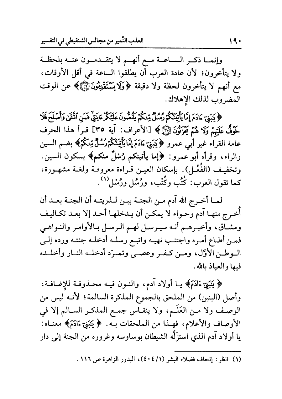 {يَا بَنِي آدَمَ} يا أولاد آدم، والنون فيه محذوفة للإضافة، وأصل (البنين) من الملحق بالجموع المذكرة السالمة؛ لأنه ليس من الوصف ولا من العَلَم، ولا ينقاس جمع المذكر السالم إلا في الأوصاف والأعلام، فهذا من الملحقات به. {يَا بَنِي آدَمَ} معناه: يا أولاد آدم الذي استزَلَّه الشيطان بوساوسه وغروره من الجنة إلى دار