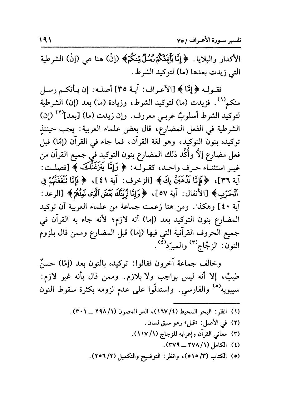 فقوله {إمَّا} [الأعراف: آية ٣٥] أصله: إن يأتكم رسل منكم (¬١). فزيدت (ما) لتوكيد الشرط، وزيادة (ما) بعد (إن) الشرطية لتوكيد الشرط أسلوبٌ عربي معروف. وإن زيدت (ما) [بعد] (¬٢) (إن) الشرطية في الفعل المضارع، قال بعض علماء العربية: يجب حينئذٍ توكيده بنون التوكيد، وهو لغة القرآن، فما جاء في القرآن (إمّا) قبل فعل مضارع إلَاّ وأُكِّد ذلك المضارع بنون التوكيد في جميع القرآن من غير استثناء حرف واحد، كقوله: {وَإمَّا يَنزَغَنَّكَ} [فصلت: آية ٣٦] {فَإمَّا نَذهَبَنَّ بِكَ} [الزخرف: آية ٤١] {فإمَّا تثْقَفَنَّهُمْ فِى الحَرب} [الأنفال: آية ٥٧] {وإمَّا نُرِيَنَّكَ بَعْضَ الَّذِي نَعِدُهُمْ} [الرعد: آية ٤٠] وهكذا. ومن هنا زعمت جماعة من علماء العربية أن توكيد المضارع بنون التوكيد بعد (إما) أنه لازم؛ لأنه جاء به القرآن في جميع الحروف القرآنية التي فيها (إما) قبل المضارع وممن قال بلزوم النون: الزجّاج (¬٣) والمبرّد (¬٤).