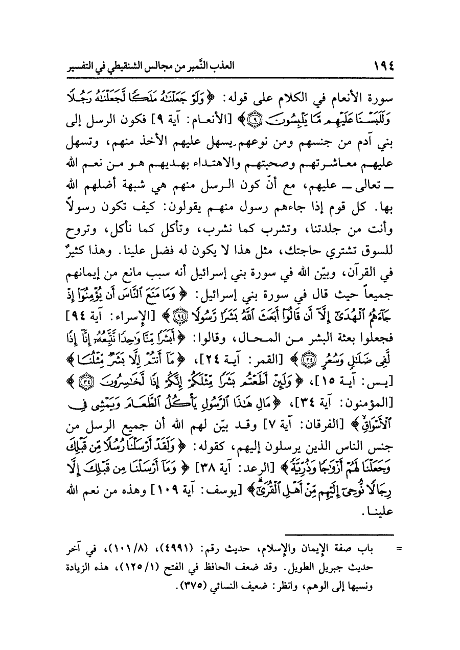 سورة الأنعام في الكلام على قوله: {وَلَوْ جَعَلْنَاهُ مَلَكاً لَّجَعَلْنَاهُ رَجُلاً وَلَلَبَسْنَا عَلَيْهِم مَّا يَلْبِسُونَ (٩)} [الأنعام: آية ٩] فَكَوْن الرُّسُل إلى بني آدم من جنسهم ومن نوعهم يسهِّل عليهم الأخذ منه، وتسهل عليهم معاشرتهم وصحبتهم والاهتداء بهديهم هو مِنْ نِعَمِ اللهِ -تعالى- عليهم، مع أنّ كون الرسل منهم هي شبهة أضلهم الله بها. كل قوم إذا جاءهم رسول منهم يقولون: كيف تكون رسولاً وأنت من جلدتنا، وتشرب كما نشرب، وتأكل كما نأكل، وتروح للسوق تشتري حاجتك، مثل هذا لا يكون له فضل علينا، وهذا كثيرٌ في القرآن، وبيّن الله في سورة بني إسرائيل أنه سبب مانع من إيمانهم جميعاً حيث قال في سورة بني إسرائيل: {وَمَا مَنَعَ النَّاسَ أَن يُؤْمِنُواْ إِذْ جَاءهُمُ الْهُدَى إِلَاّ أَن قَالُواْ أَبَعَثَ الله بَشَراً رَّسُولاً} [الإسراء: آية ٩٤] فجعلوا بعثة البشر من المحال، وقالوا: {أَبَشَراً مِّنَّا وَاحِداً نَّتَّبِعُهُ إِنَّا إِذاً لَّفِي ضَلَالٍ وَسُعُرٍ} [القمر: آية ٢٤] {مَا أَنتُمْ إِلَاّ بَشَرٌ مِّثْلُنَا} [يس: آية ١٥] {وَلَئِنْ أَطَعْتُم بَشَراً مِثْلَكُمْ إِنَّكُمْ إِذاً لَّخَاسِرُونَ} [المؤمنون: آية ٣٤] {مَالِ هَذَا الرَّسُولِ يَأْكُلُ الطَّعَامَ وَيَمْشِي فِي الْأَسْوَاقِ} [الفرقان: آية ٧] وقد بيّن لهم الله أن جميع الرسل من جنس الناس الذين يرسلون إليهم، كقوله: {وَلَقَدْ أَرْسَلْنَا رُسُلاً مِّن قَبْلِكَ وَجَعَلْنَا لَهُمْ أَزْوَاجاً وَذُرِّيَّةً} [الرعد: آية ٣٨] {وَمَا أَرْسَلْنَا مِن قَبْلِكَ إِلَاّ رِجَالاً نُّوحِي إِلَيْهِم مِّنْ أَهْلِ الْقُرَى} [يوسف: آية ١٠٩] وهذه من نعم الله علينا.