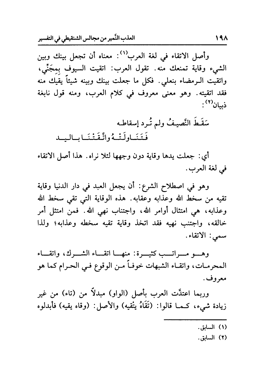وأصل الاتقاء في لغة العرب (¬١): معناه أن تجعل بينك وبين الشيء وقاية تمنعك منه. تقول العرب: اتقيت السيوف بِمِجَنِّي، واتقيت الرمضاء بنعلي. فكل ما جعلت بينك وبينه شيئاً يقيك منه فقد اتقيته. وهو معنى معروف في كلام العرب، ومنه قول نابغة ذبيان (¬٢):