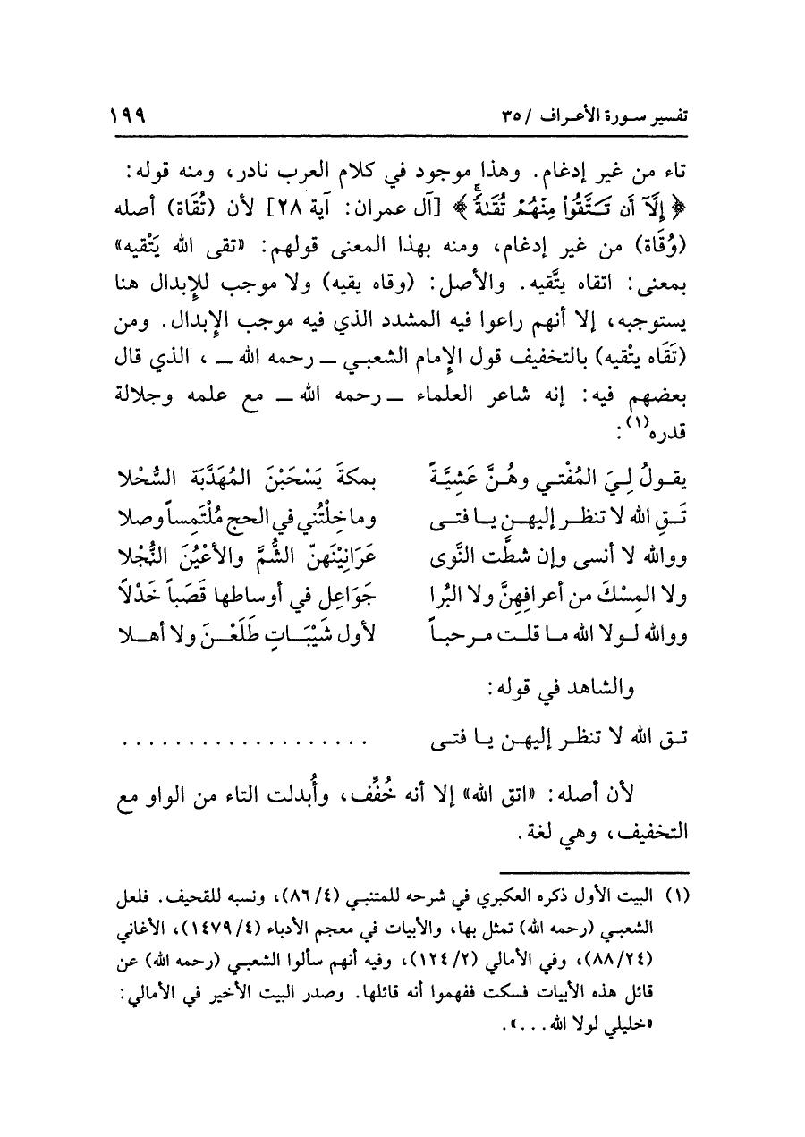 تاء من غير إدغام. وهذا موجود في كلام العرب نادر، ومنه قوله: {إِلَاّ أَن تَتَّقُواْ مِنْهُمْ تُقَاةً} [آل عمران: آية ٢٨] لأن (تُقَاة) أصله (وُقَاة) من غير إدغام، ومنه بهذا المعنى قولهم: «تقى الله يَتْقيه» بمعنى: اتقاه يتَّقيه. والأصل: (وقاه يقيه) ولا موجب للإبدال هنا يستوجبه، إلا أنهم راعوا فيه المشدد الذي فيه موجب الإبدال. ومن (تَقَاه يتْقيه) بالتخفيف قول الإمام الشعبي -رحمه الله- الذي قال بعضهم فيه: إنه شاعر العلماء -رحمه الله- مع علمه وجلالة قدره (¬١):
