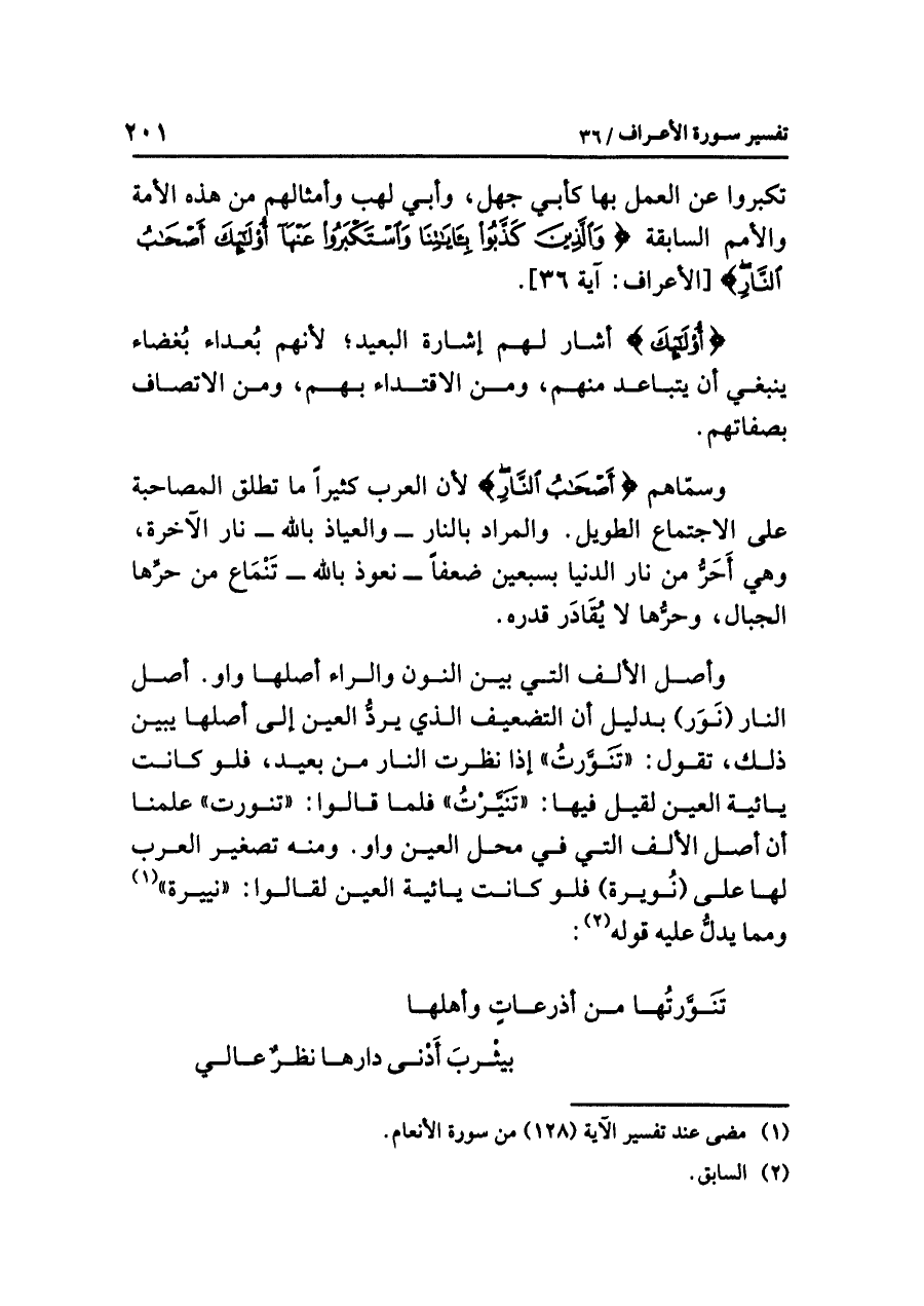 وأصل الألف التي بين النون والراء أصلها واو. أصل النار (نَوَر) بدليل أن التضعيف الذي يردُّ العين إلى أصلها يبين ذلك، تقول: (تنَوَّرتُ) إذا نظرت النار من بعيد، فلو كانت يائية العين لقيل فيها: (تَنَيَّرْتُ) فلما قالوا: (تنورت) علمنا أن أصل الألف التي في محل العين واو، ومنه تصغير العرب لها على (نُويرة) فلو كانت يائية العين لقالوا: «نُييرة» (¬١) ومما يدلُّ عليه قوله (¬٢):