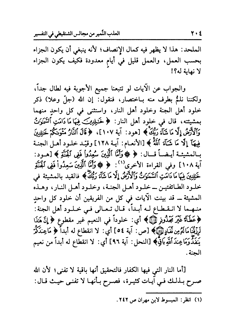 والجواب عن الآيات لو تتبعنا جميع الأجوبة فيه لطال جدّاً، ولكننا نلمُّ بطرف منه باختصار، فنقول: إن الله (جلّ وعلا) ذكر خلود أهل الجنة وخلود أهل النار، واستثنى في كل واحدٍ منهما بمشيئته، قال في خلود أهل النار: {خَالِدِينَ فِيهَا مَا دَامَتِ السَّمَاوَاتُ وَالأَرْضُ إِلَاّ مَا شَاء رَبُّكَ} [هود: آية ١٠٧] {قَالَ النَّارُ مَثْوَاكُمْ خَالِدِينَ فِيهَا إِلَاّ مَا شَاء الله} [الأنعام: آية ١٢٨] وقيّد خلود أهل الجنة بالمشيئة أيضاً قال: {وَأَمَّا الَّذِينَ سُعِدُواْ فَفِي الْجَنَّةِ} [هود: آية ١٠٨] وفي القراءة الأخرى (¬١): {وَأَمَّا الَّذِينَ سَعِدُواْ فَفِي الْجَنَّةِ خَالِدِينَ فِيهَا مَا دَامَتِ السَّمَاوَاتُ وَالأَرْضُ إِلَاّ مَا شَاء رَبُّكَ} فالقيد بالمشيئة في خلود الطائفتين - خلود أهل الجنة وخلود أهل النار، وهذه المشيئة - قد بينت الآيات في كل من الفريقين أن خلود كل واحدٍ منهما لا انقطاع له أبداً، قال تعالى في خلود أهل الجنة: {عَطَاء غَيْرَ مَجْذُوذٍ} أي: خلوداً في النعيم غير مقطوع {إِنَّ هَذَا لَرِزْقُنَا مَا لَهُ مِن نَّفَادٍ (٥٤)} [ص: آية ٥٤] أي: لا انقطاع له أبداً {مَا عِندَكُمْ يَنفَدُ وَمَا عِندَ الله بَاقٍ} [النحل: آية ٩٦] أي: لا انقطاع له أبداً من نعيم الجنة.