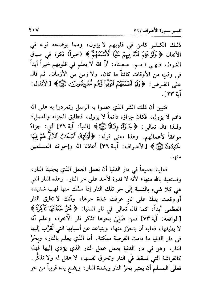 فعلينا جميعاً في دار الدنيا أن نعمل العمل الذي يجنبنا النار، ونستعيذ بالله منها؛ لأنه لا قدرة لأحد على حر النار. وهذه النار التي هي كَلَا شَيْءٍ بالنسبة إلى حَرِّ تِلْكَ النَّارِ إذا مسَّك منها لهب شديد، أو وقعت يدك على نارٍ عرفت شدة حرها، وأنك لا تطيق النار العظمى أبداً، كما قال تعالى في نار الدنيا: {نَحنُ جَعَلْناهَا تَذْكِرَةً} [الواقعة: آية ٧٣] فمن صَلِيَ بِحَرِّهَا تَذَكَّرَ نَارَ الآخرة، وعلم أنه لا يطيقها، فعليه أن يتحرَّز منها، ويتباعد عن أسبابها التي تُقرِّب إليها في دار الدنيا ما دامت الفرصة ممكنة. أما الذي يعلم بالنار، وبِحَرِّ النار، وهو في دار الدنيا يعمل عمل النار الذي يؤدي إليها فهذا كالفراشة التي تسقط في النار وتحرق نفسها، لا عقل له ولا تذكُّر. فعلى المسلم أن يعتبر بحرِّ النار وبشدة النار، ويضع يده قريباً من حر