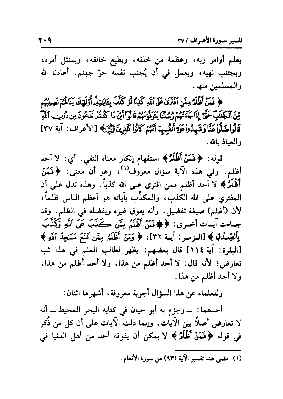 أحدهما، وَجَزَمَ بِهِ أبُو حَيَّان في كتابه البحر المحيط: أنه لا تعارض أصلاً بين الآيات، وإنما دَلَّتِ الآيات على أن كل من ذُكر في قوله: {فَمَنْ أَظلَمُ} لا يمكن أن يفوقه أحد من أهل الدنيا في