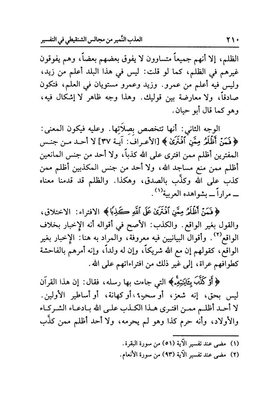 الوجه الثاني: أنها تتخصص بِصِلَاتِها، وعليه فيكون المعنى: {فَمَنْ أَظْلَمُ مِمَّنِ افْتَرَى} [الأعراف: آية ٣٧] لا أحد من جنس المفترين أظلم ممن افترى على الله كذباً، ولا أحد من جنس المانعين أظلم ممن منع مساجد الله، ولا أحد من جنس المكذّبين أظلم ممن كذب على الله وكذَّب بالصدق، وهكذا. والظلم قد قدمنا معناه -مراراً- بشواهده العربية (¬١).