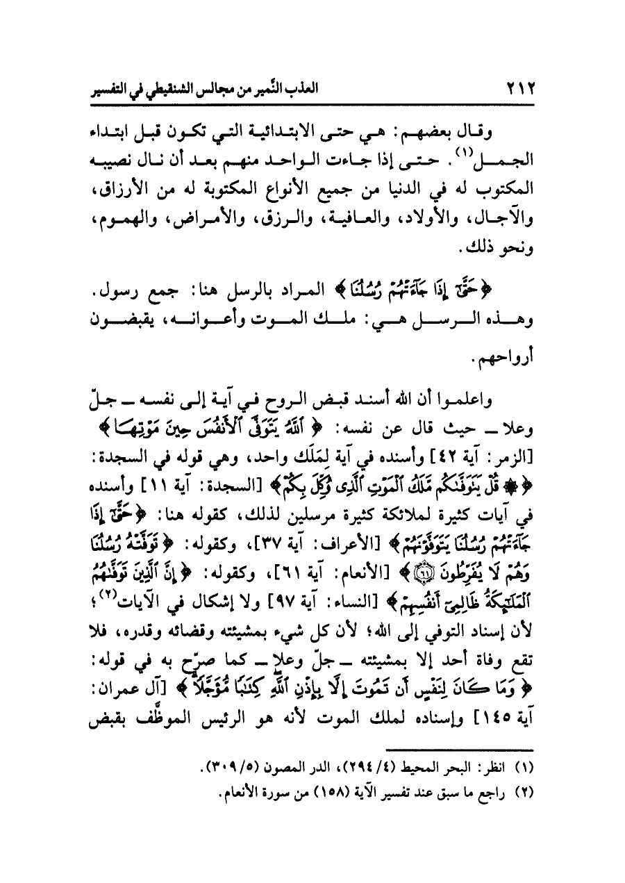 واعلموا أن الله أسند قبض الروح في آية إلى نفسه -جلّ وعلا- حيث قال عن نفسه: {اللَّهُ يَتَوَفَّى الْأَنفُسَ حِينَ مَوْتِهَا} [الزمر: آية ٤٢] وأسنده في آية لِمَلَك واحد، وهي قوله في السجدة: {قُلْ يَتَوَفَّاكُم مَّلَكُ الْمَوْتِ الَّذِي وُكِّلَ بِكُمْ} [السجدة: آية ١١] وأسنده في آيات كثيرة لملائكة كثيرة مرسلين لذلك، كقوله هنا: {حَتَّى إِذَا جَاءتْهُمْ رُسُلُنَا يَتَوَفَّوْنَهُمْ} [الأعراف: آية ٣٧] وكقوله: {تَوَفَّتْهُ رُسُلُنَا وَهُمْ لَا يُفَرِّطُونَ} [الأنعام: آية ٦١] وكقوله: {إِنَّ الَّذِينَ تَوَفَّاهُمُ الْمَلآئِكَةُ ظَالِمِي أَنْفُسِهِمْ} [النساء: آية ٩٧] ولا إشكال في الآيات (¬٢)؛ لأن إسناد التوفي إلى الله؛ لأن كل شيء بمشيئته وقضائه وقدره، فلا تقع وفاة أحد إلا بمشيئته - جلّ وعلا - كما صرّح به في قوله: {وَمَا كَانَ لِنَفْسٍ أَنْ تَمُوتَ إِلَاّ بِإِذْنِ الله كِتَاباً مُّؤَجَّلاً} [آل عمران: آية ١٤٥] وإسناده لملك الموت لأنه هو الرئيس الموظَّف بقبض