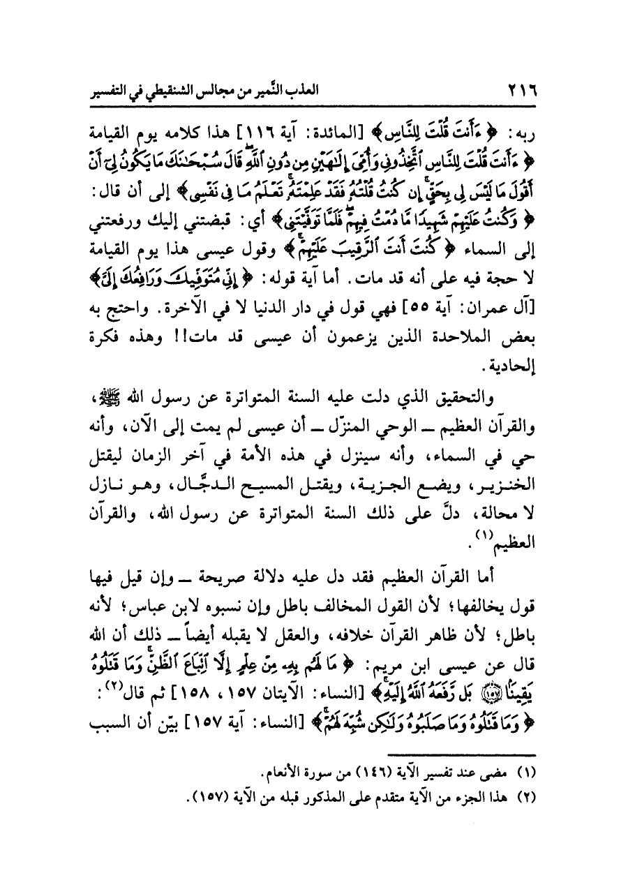 ربه: {أَأَنتَ قُلتَ لِلنَّاسِ} [المائدة: آية ١١٦] هذا كلامه يوم القيامة {أَأَنتَ قُلتَ لِلنَّاسِ اتَّخِذُونِي وَأُمِّيَ إِلَهَيْنِ مِن دُونِ الله قَالَ سُبْحَانَكَ مَا يَكُونُ لِي أَنْ أَقُولَ مَا لَيْسَ لِي بِحَقٍّ إِن كُنتُ قُلْتُهُ فَقَدْ عَلِمْتَهُ تَعْلَمُ مَا فِي نَفْسِي} إلى أن قال: {وَكُنتُ عَلَيْهِمْ شَهِيداً مَّا دُمْتُ فِيهِمْ فَلَمَّا تَوَفَّيْتَنِي} أي: قبضتني إليك ورفعتني إلى السماء {كُنتَ أَنتَ الرَّقِيبَ عَلَيْهِمْ} وقول عيسى هذا يوم القيامة لا حجة فيه على أنه قد مات، أما آية قوله: {إِنِّي مُتَوَفِّيكَ وَرَافِعُكَ إِلَيَّ} [آل عمران: آية ٥٥] فهي قول في دار الدنيا لا في الآخرة. واحتج به بعض الملاحدة الذين يزعمون أن عيسى قد مات!! وهذه فكرة إلحادية.