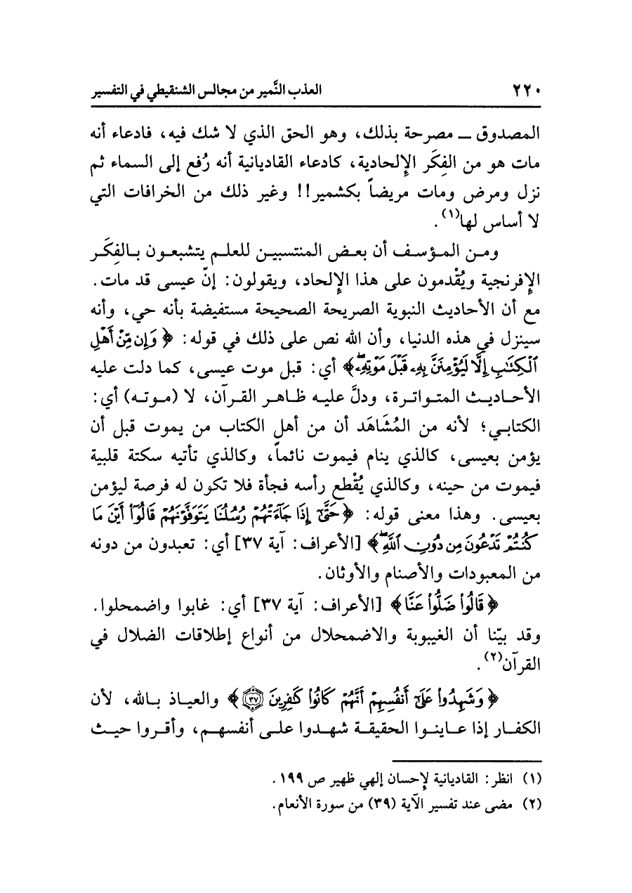 ومن المؤسف أن بعض المنتسبين للعلم يَتَشَبَّعُون بالفِكَر الإفرنجية ويُقْدمون على هذا الإلحاد، ويقولون: إنَّ عيسى قد مات. مع أن الأحاديث النبوية الصريحة الصحيحة مستفيضة بأنه حي، وأنه سينزل في هذه الدنيا، وأن الله نص على ذلك في قوله: {وَإِن مِّنْ أَهْلِ الْكِتَابِ إِلَاّ لَيُؤْمِنَنَّ بِهِ قَبْلَ مَوْتِهِ} أي: قبل موت عيسى، كما دلت عليه الأحاديث المتواترة، ودلَّ عليه ظاهر القرآن، لا (موته) أي: الكتابي؛ لأنه من المُشَاهَد أن من أهل الكتاب من يموت قبل أن يؤمن بعيسى، كالذي ينام فيموت نائماً، وكالذي تأتيه سكتة قلبية فيموت من حينه، وكالذي يُقْطع رأسه فجأة ولا تكون له فرصة ليؤمن بعيسى. وهذا معنى قوله: {حَتَّى إِذَا جَاءتْهُمْ رُسُلُنَا يَتَوَفَّوْنَهُمْ قَالُواْ أَيْنَ مَا كُنتُمْ تَدْعُونَ مِن دُونِ الله} [الأعراف: آية ٣٧] أي: تعبدون من دونه من المعبودات والأصنام والأوثان.