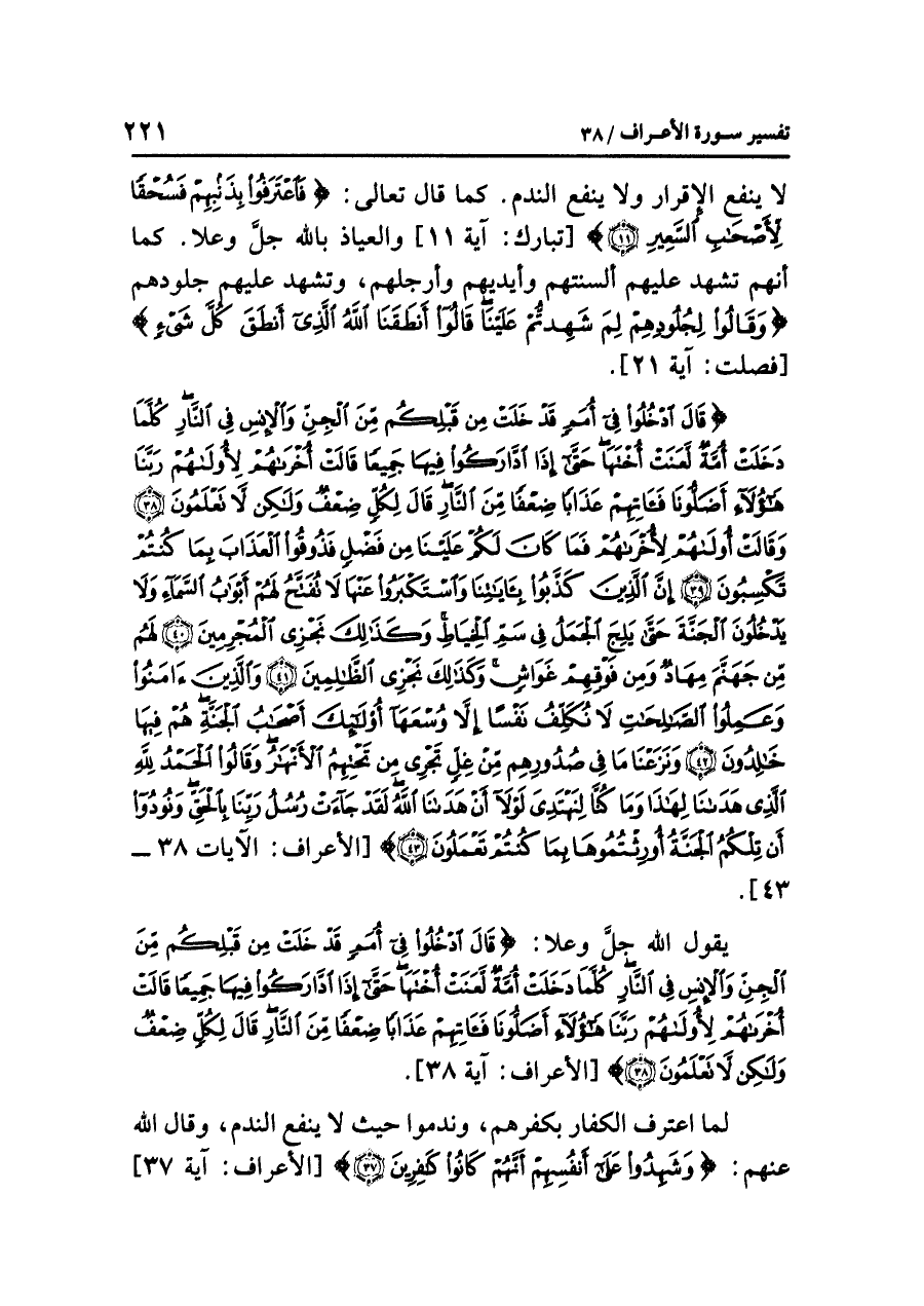 {قَالَ ادْخُلُواْ فِي أُمَمٍ قَدْ خَلَتْ مِن قَبْلِكُم مِّن الْجِنِّ وَالإِنسِ فِي النَّارِ كُلَّمَا دَخَلَتْ أُمَّةٌ لَّعَنَتْ أُخْتَهَا حَتَّى إِذَا ادَّارَكُواْ فِيهَا جَمِيعاً قَالَتْ أُخْرَاهُمْ لأُولَاهُمْ رَبَّنَا هَؤُلاء أَضَلُّونَا فَآتِهِمْ عَذَاباً ضِعْفاً مِّنَ النَّارِ قَالَ لِكُلٍّ ضِعْفٌ وَلَكِن لَاّ تَعْلَمُونَ (٣٨) وَقَالَتْ أُولَاهُمْ لأُخْرَاهُمْ فَمَا كَانَ لَكُمْ عَلَيْنَا مِن فَضْلٍ فَذُوقُواْ الْعَذَابَ بِمَا كُنتُمْ تَكْسِبُونَ (٣٩) إِنَّ الَّذِينَ كَذَّبُواْ بِآيَاتِنَا وَاسْتَكْبَرُواْ عَنْهَا لَا تُفَتَّحُ لَهُمْ أَبْوَابُ السَّمَاءِ وَلَا يَدْخُلُونَ الْجَنَّةَ حَتَّى يَلِجَ الْجَمَلُ فِي سَمِّ الْخِيَاطِ وَكَذَلِكَ نَجْزِي الْمُجْرِمِينَ (٤٠) لَهُم مِّن جَهَنَّمَ مِهَادٌ وَمِن فَوْقِهِمْ غَوَاشٍ وَكَذَلِكَ نَجْزِي الظَّالِمِينَ (٤١) وَالَّذِينَ آمَنُواْ وَعَمِلُواْ الصَّالِحَاتِ لَا نُكَلِّفُ نَفْساً إِلَاّ وُسْعَهَا أُوْلَئِكَ أَصْحَابُ الْجَنَّةِ هُمْ فِيهَا خَالِدُونَ (٤٢) وَنَزَعْنَا مَا فِي صُدُورِهِم مِّنْ غِلٍّ تَجْرِي مِن تَحْتِهِمُ الأَنْهَارُ وَقَالُواْ الْحَمْدُ لِلّهِ الَّذِي هَدَانَا لِهَذَا وَمَا كُنَّا لِنَهْتَدِيَ لَوْلا أَنْ هَدَانَا الله لَقَدْ جَاءتْ رُسُلُ رَبِّنَا بِالْحَقِّ وَنُودُواْ أَن تِلْكُمُ الْجَنَّةُ أُورِثْتُمُوهَا بِمَا كُنتُمْ تَعْمَلُونَ (٤٣)} [الأعراف: الآيات ٣٨ - ٤٣].