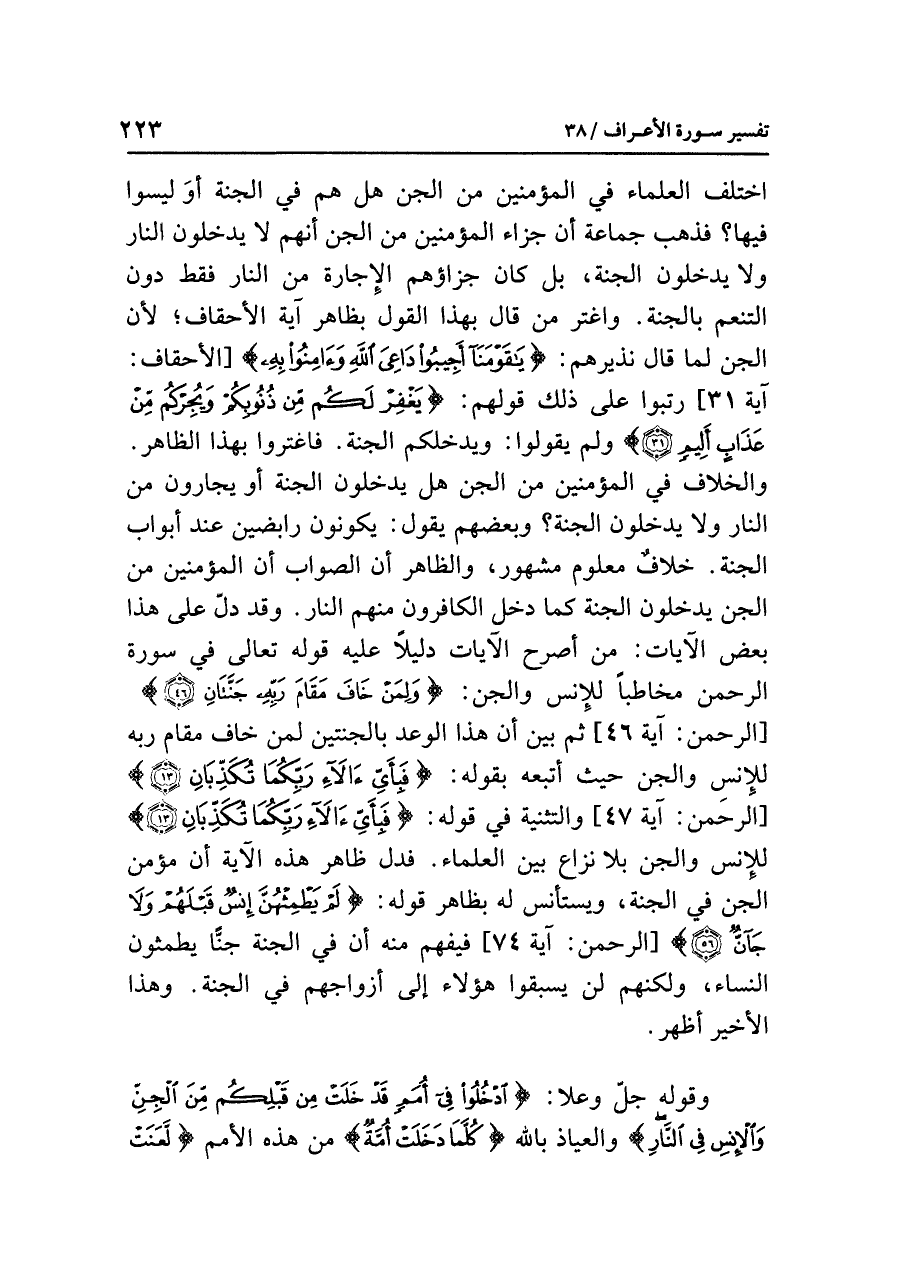 اختلف العلماء في المؤمنين من الجن هل هم في الجنة أو ليسوا فيها؟ فذهب جماعة أن جزاء المؤمنين من الجن أنهم لا يدخلون النار ولا يدخلون الجنة، بل كان جزاؤهم الإجارة من النار فقط دون التنعم بالجنة. واغتر من قال بهذا القول بظاهر آية الأحقاف؛ لأن الجن لما قال نذيرهم: {يَا قَوْمَنَا أَجِيبُوا دَاعِيَ الله وَآمِنُوا بِهِ} [الأحقاف: آية ٣١] رتبوا على ذلك قولهم: {يَغْفِرْ لَكُم مِّن ذُنُوبِكُمْ وَيُجِرْكُم مِّنْ عَذَابٍ أَلِيمٍ} ولم يقولوا: ويدخلكم الجنة. فاغتروا بهذا الظاهر. والخلاف في المؤمنين من الجن هل يدخلون الجنة أو يجارون من النار ولا يدخلون الجنة؟ وبعضهم يقول: يكونون رابضين عند أبواب الجنة، خلافٌ معلوم مشهور، والظاهر أن الصواب أن المؤمنين من الجن يدخلون الجنة كما دخل الكافرون منهم النار، وقد دلّ على هذا بعض الآيات: من أصرح الآيات دليلاً عليه قوله تعالى في سورة الرحمن مخاطباً للإنس والجن: {ولِمَنْ خَافَ مَقَامَ رَبّه جَنَّتَانِ (٤٦)} [الرحمن: آية ٤٦] ثم بين أن هذا الوعد بالجنتين لمن خاف مقام ربه للإنس والجن حيث أتبعه بقوله: {فَبِأَيِّ آلَاء رَبِّكُمَا تُكَذِّبَانِ (٤٧)} [الرحمن: آية ٤٧] والتثنية في قوله: {فَبِأَيِّ آلَاء رَبِّكُمَا تُكَذِّبَانِ (٤٧)} للإنس والجن بلا نزاع بين العلماء. فدل ظاهر هذه الآية أن مؤمن الجن في الجنة، ويستأنس له بظاهر قوله: {لَمْ يَطْمِثْهُنَّ إِنسٌ قَبْلَهُمْ وَلَا جَانٌّ} [الرحمن: آية ٧٤] فيفهم منه أن في الجنة جنًّا يطمثون النساء، ولكنهم لم يسبقوا هؤلاء أزواجهم في الجنة. وهذا الأخير أظهر.