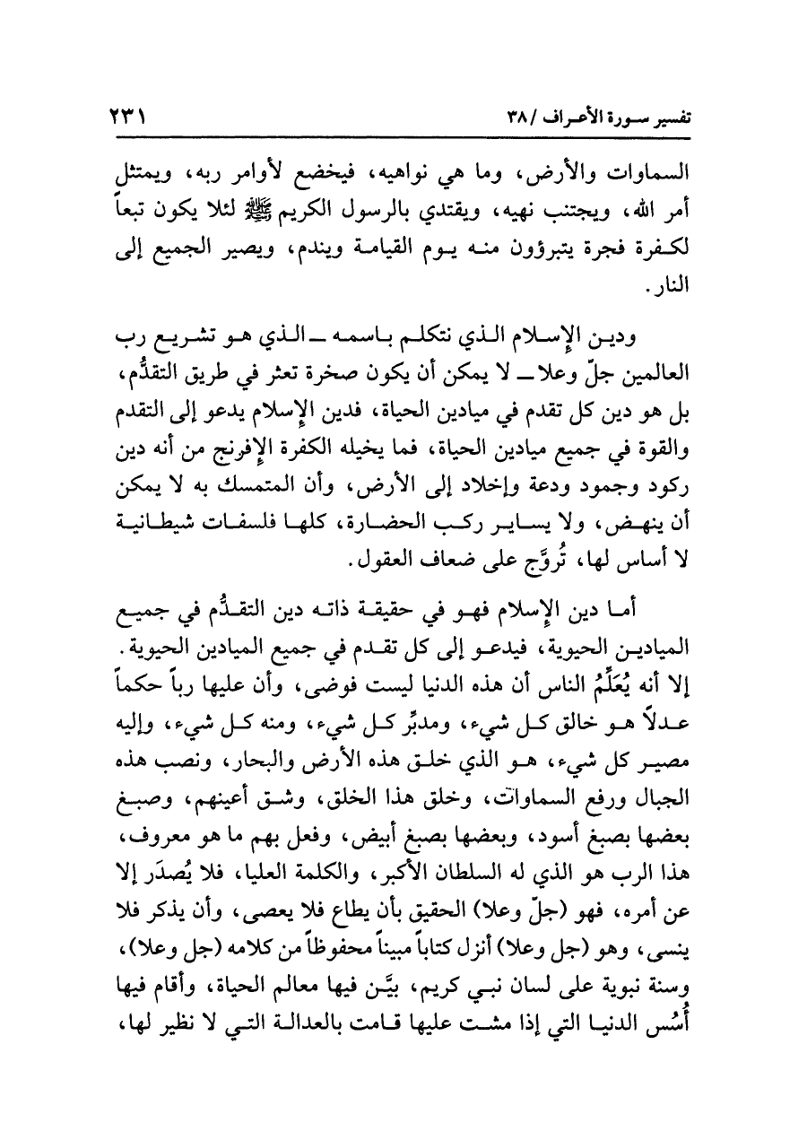 أما دين الإسلام فهو في حقيقة ذاته دين التقدُّم في جميع الميادين الحيوية، فيدعو إلى كل تقدم في جميع الميادين الحيوية، إلا أنه يُعَلِّمُ الناس أن هذه الدنيا ليست فوضى، وأن عليها ربّاً حكماً عدلاً هو خالق كل شيء، ومدبِّر كل شيء، ومنه كل شيء، وإليه مصير كل شيء، هو الذي خلق هذه الأرض والبحار، ونصب هذه الجبال ورفع السماوات، وخلق هذا الخلق، وشق أعينهم، وصبغ بعضها بصبغ أسود، وبعضها بصبغ أبيض، وفعل بهم ما هو معروف، هذا الرب هو الذي له السلطان الأكبر، والكلمة العليا، فلا يُصدَر إلا عن أمره، فهو (جلّ وعلا) الحقيق بأن يطاع فلا يُعْصى، وأن يذكر فلا يُنْسَى، وهو (جل وعلا) أنزل كتاباً مبيناً محفوظاً من كلامه (جل وعلا)، وسنة نبوية على نبي كريم، بيَّن فيها معالم الحياة، وأقام فيها أُسس الدنيا التي إذا مشت عليها قامت بالعدالة التي لا نظير لها،
