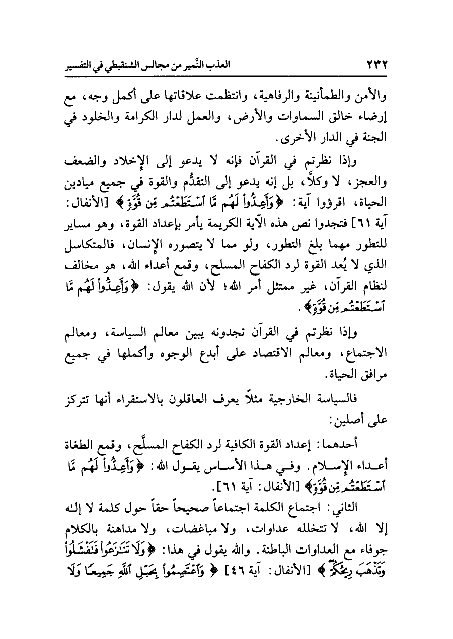 وإذا نظرتم في القرآن فإنه لا يدعو إلى الإخلاد والضعف والعجز، لا وكلَاّ، بل إنه يدعو إلى التقدُّم والقوة في جميع ميادين الحياة، اقرءوا آية: {وَأَعِدُّواْ لَهُم مَّا اسْتَطَعْتُم مِّن قُوَّةٍ} [الأنفال: آية ٦١] فتجدوا نص هذه الآية الكريمة يأمر بإعداد القوة، وهو مساير للتطور مهما بلغ التطور، ولو مما لا يتصوره الإنسان، فالمتكاسل الذي لا يُعد القوة لرد الكفاح المسلح، وقمع أعداء الله، هو مخالف لنظام القرآن، غير ممتثل أمر الله؛ لأن الله يقول: {وَأَعِدُّواْ لَهُم مَّا اسْتَطَعْتُم مِّن قُوَّةٍ}.