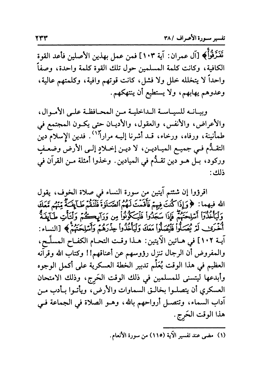 اقرءوا إن شئتم آيتين من سورة النساء في صلاة الخوف، يقول الله فيهما: {وَإِذَا كُنتَ فِيهِمْ فَأَقَمْتَ لَهُمُ الصَّلَاةَ فَلْتَقُمْ طَآئِفَةٌ مِّنْهُم مَّعَكَ وَلْيَأْخُذُواْ أَسْلِحَتَهُمْ فَإِذَا سَجَدُواْ فَلْيَكُونُواْ مِن وَرَآئِكُمْ وَلْتَأْتِ طَآئِفَةٌ أُخْرَى لَمْ يُصَلُّواْ فَلْيُصَلُّواْ مَعَكَ وَلْيَأْخُذُواْ حِذْرَهُمْ وَأَسْلِحَتَهُمْ} [النساء: آية ١٠٢] وفي هاتين الآيتين: هذا وقت التحام الكفاح المسلَّح، والمفروض أن الرجال تنزل رؤوسهم عن أعناقهم!! وكتاب الله وقرآنه العظيم في هذا الوقت يُعلِّم تدبير الخطة العسكرية على أكمل الوجوه وأبدعها ليتسنى للمسلمين في ذلك الوقت الحَرِج، وذلك الامتحان العسكري أن يتصلوا بخالق السماوات والأرض، ويأتوا بأدب من آداب السماء، وتتصل أرواحهم بالله، وهو الصلاة في الجماعة في هذا الوقت الحَرِج.